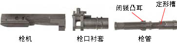 射击时,枪管与枪机在火药气体的压力下共同向后运动,而枪口衬套是固定不动的;枪管与枪机经过4mm的自由行程后,在枪管衬套凸轮与枪管定型槽的引导下,枪管开始绕自身轴线顺时针方向旋转,使枪管中部的闭锁凸耳从枪机前部的闭锁凹槽中脱离;此时,枪管受枪管衬套的限制而停止运动,而枪机则在膛内气体的压力下继续后坐,拉出空弹壳并抛出;当枪机复进时,从弹匣中推出最上面的一发弹,然后按上述动作相反操作,直至完全闭锁。
