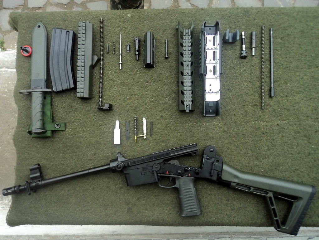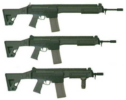 从上到下:装刺刀的7.62 IA2卡宾型,不装刺刀的7.62 IA2短枪管型,装刺刀和不装刺刀的5.56 IA2的卡宾型