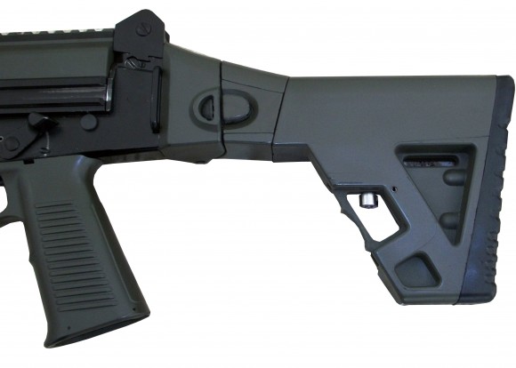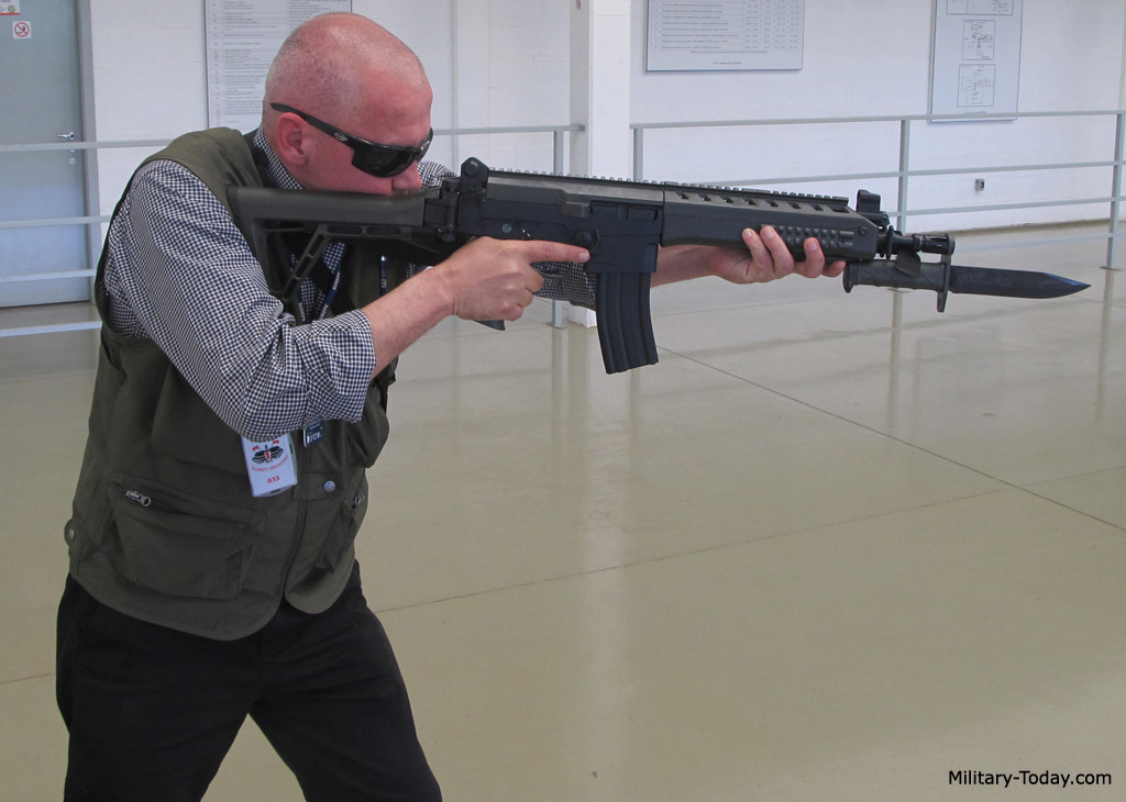 机械瞄具包括片状准星和柱形照门,翻转式表尺有150米和300米两档。机匣顶部延伸至活塞筒上方有全长式的皮卡汀尼导轨,可安装其他辅助瞄准装置,另外护木的左右侧和底部也各附有一段皮卡汀尼导轨用于安装战术灯、前握把等附件,下挂式榴弹发射器也是通过护木底部的皮卡汀尼导轨来安装。因为皮卡汀尼导轨的结构会增加重量,所以虽然机匣用铝来代替钢,但全枪重量变化不大。