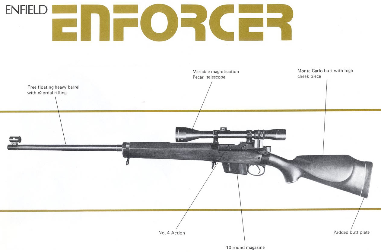 另外在1970年初,在恩菲尔德的皇家轻武器工厂也改装了L42A1的民用型,被称为“强制者”(Enforcer),它与L42A1有许多区别,如运动型枪托和手枪形半握把,还有整体式的贴腮板。“强制者”型使用比赛型的机械瞄具和可变倍率的商业瞄准镜,不但被民间用于射击比赛,也被英国的警察部队如伦敦警察厅的“蓝色贝雷帽”所装备。