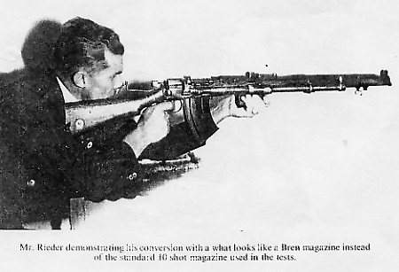 赖德自动步枪(Reider Automatic Rifle)南非人H. J. R. Rieder在1940年至1941年间设计的SMLE半自动改装枪,与上述两种型号相比,赖德自动步枪不需要很大的改装,只是在原来的SMLE步枪上加上一套装置就能实现自动装填功能。