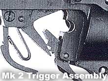 No.4 Mk.I*的保险机构示图,左图为射击状态,右图为保险状态,在保险状态下,一个旋转的半圆销会凸出来顶住枪机使其不能操作。如果枪机已经处于待击状态,那么这个半圆销也能钩住阻铁使其不能击发。阻铁块上有好几个缺口,其中一个就是为这个半圆销而设的。(此枪为半瓶醋藏品)