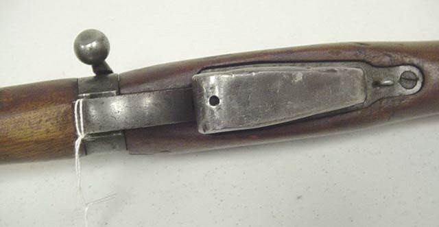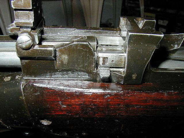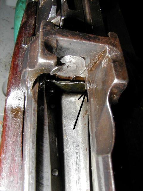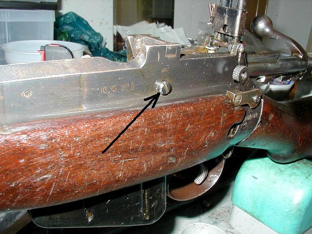 李-恩菲尔德的抛壳挺其实就是一颗拧入机匣内的螺丝(箭头所示)。从外面看螺丝头很大,但从里面看,螺丝头凸出的部位微不足道,不仔细看不找不着。
