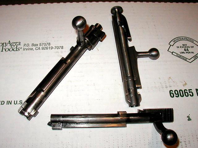 三种旋转后拉式枪机的对比,左边为毛瑟,右边为莫辛,下面为李-恩菲尔德