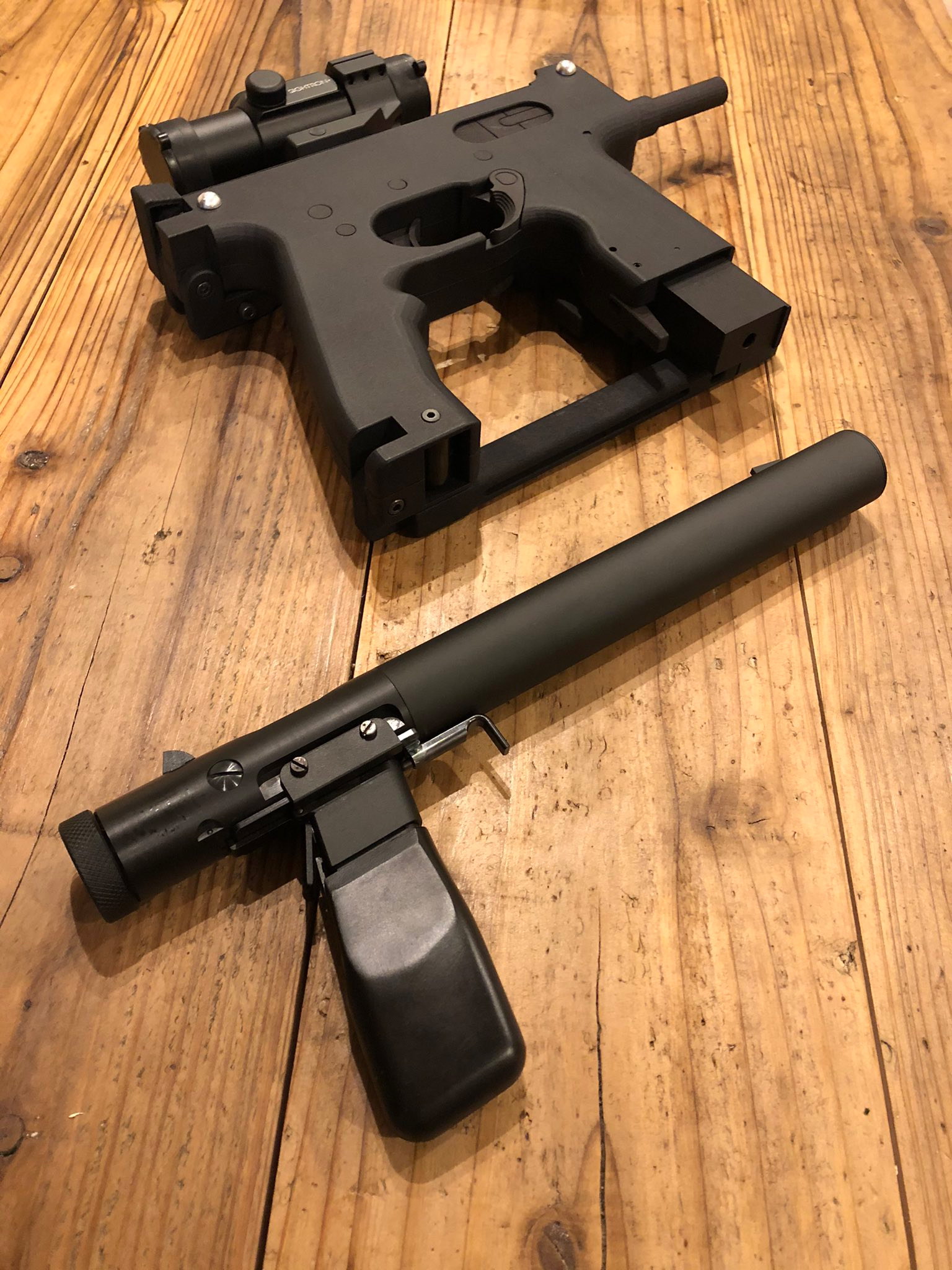 由于布希曼冲锋枪一直卖不出去,后来该枪的设计和专利被一个叫George Ealovega的美国人买走,这个美国人取消了布希曼冲锋枪的电子射速调节器,把采用弹簧的机械式复进簧改为类似汽车减震器的液压系统,用这样的设计同样可能把射速降低。而如果用户需要较高的射速,只需要不足一分钟就能重新更换成传统的复进簧。新枪具有两个独立的机械保险,一个是握把保险,另一个是扳机护圈前方的保险柄。此外他还改变了该枪的外形,机匣顶部增加皮卡汀尼导轨便于安装瞄准镜,新的折叠枪托有伸缩功能,让穿着防弹衣或身形较小的用户也能使用舒适。