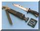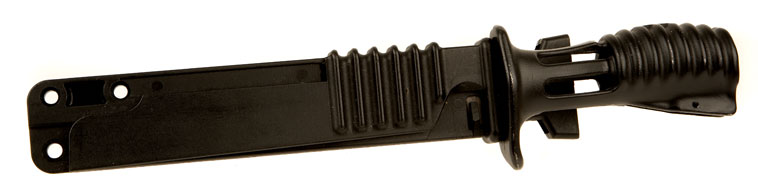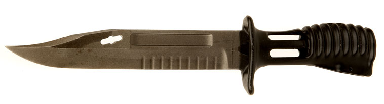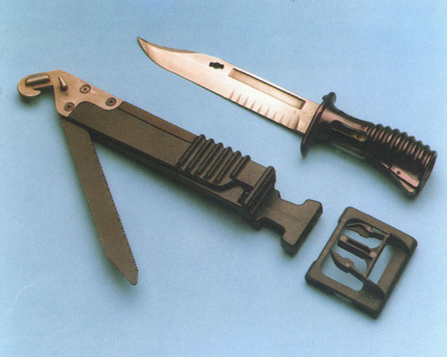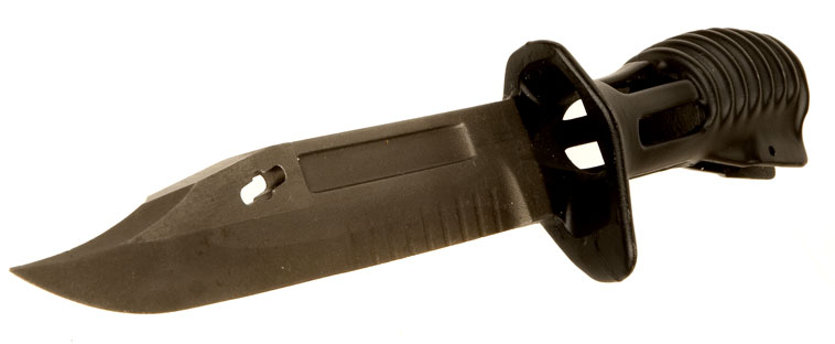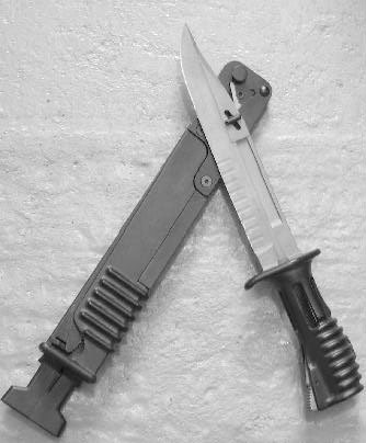 多功能刺刀用不锈钢铸成,筒形中空刀柄可插在消焰器上,贯通式的设计即使安上刺刀后 也能开枪。取下时则是格斗用的匕首,刀刃后部有排齿,用以切割绳索;刺n与刀鞘配合可剪断电线;刀鞘内装有镶嵌碳化钨的锯条,能锯钢铁等多种材料。刀鞘背上还装有磨刀石。但由于刺刀刀柄是全金属的,而且是用刀柄套进消焰器的方式固定刺刀,导致上刺刀状况下射击后,刀柄会发烫而无法握持。而且也不能用于切割通电的电线,刀尖还有易折断的问题。