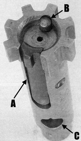 导气管外形象活塞,其上有三个位置:正常气孔、加大气孔、关闭气孔。加大气孔供恶劣条件下使用,关闭气孔供发射枪榴弹时使用。射击时导气套管在火药气体推动下后退,传递后坐冲量,经过一个短行程后,由四个径向孔排出废气。活塞杆负责把导气套管传递过来的冲量传递给枪机框。