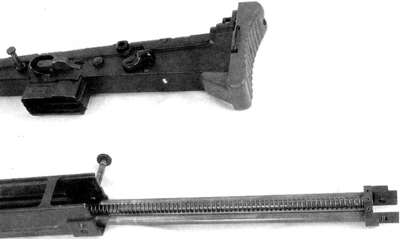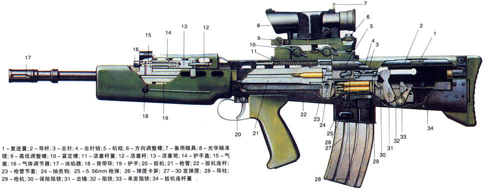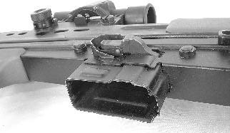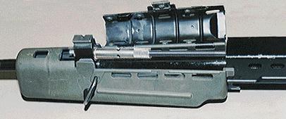 与常规步枪不同的是,枪机运动的导轨不在机匣上,而是两根导杆,而与其组合的第三根杆则为复进簧导杆,长导杆和复进簧导杆随枪机前后运动。导杆的前端与节套联接,节套经压配合后焊接在机匣上,而枪管与节套则由螺纹联接。枪管口部装有消焰器,其外径22mm,可用以发射西欧各国的枪榴弹,也能当刺刀座。