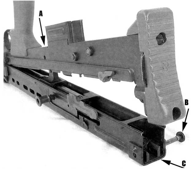下机匣上装有扳机、握把,弹匣座和托底板等。握把内装有卡销式准星和照门,以供急用。发射机构是一个完整组件,用两个销子与机匣结合。扳机位于弹匣座的前方,因此有一长扳机联杆通向后方,左侧有快慢机,可选择半自动或全自动射击。弹匣与M16步枪通用,容弹量为3O发,每一名士兵配带8个弹匣。