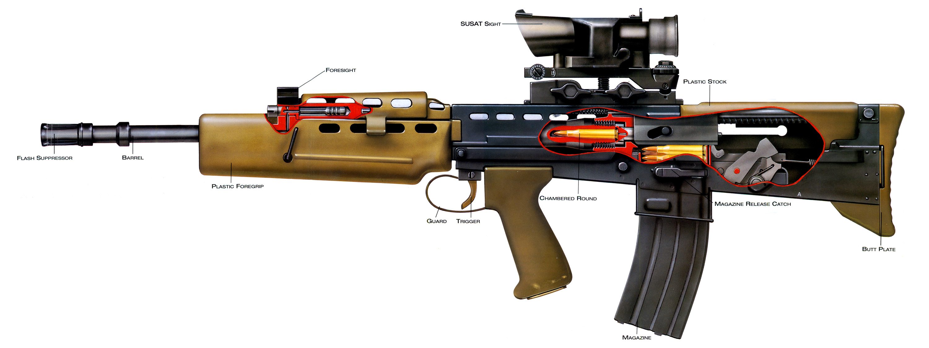 机匣上方的滑座,既可装带照门的提把,又可装光学瞄具。氚光(SUSAT)瞄准镜L9A1是L85A1的关键装置。其瞄准分划用氚光照明,无需电池供电,放大率为4倍,视场10°。L9A1瞄准镜是完全密封的,校零调整装置位于镜筒外表,结构非常结实。L9A1瞄准镜固装在一个可调方向与高低的支座上,而支座又可在一个固定在上机匣顶面的燕尾座上滑动,此外,一个应急用的机械瞄准具固装在瞄准镜体上。射手可根据自己体格和视力的不同,将瞄准镜分前后三个位置安装在导轨中。瞄准分划由一种塑科光角柱组成。瞄准时,只要把光角柱对准目标就可以射击了。瞄准镜重0.8千克,虽使全枪重量相应增加,机动性有所降低,但利大于弊。其优点是:通过镜子瞄准,靶子和瞄准分划可以同时被看见,不象机械瞄具那样要“三点一线”;放大倍率高;瞄准距离远;能在扬尘、云雾、暗夜等不良气象条件下瞄准;可以排除侧光、逆光的干扰,减少瞄准误差。因此,L85A1的射击精度很高,据说,L9A1氚光瞄准镜与普通瞄具相比,对一般射手,瞄准射击精度可提高40%,对无经验的射手,可提高80%。
