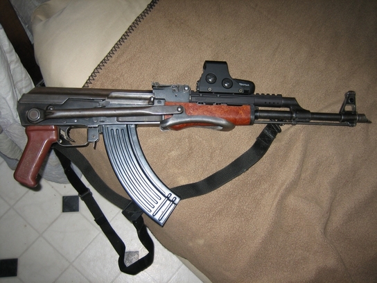 一支安装了UltiMAK导轨座的AKKS,导轨座上安装了EO-Tech HOLO瞄准镜