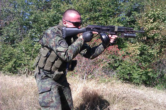 一个塞尔维亚士兵,所使用的保加利亚AR-M1上安装了塞尔维亚生产的BGA-40榴弹发射器和M72B1弹鼓