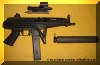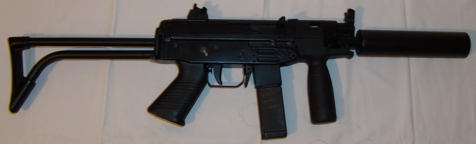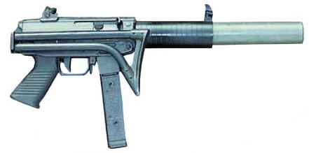 消声型SAF-SD类似于MP5SD,安装有整体式消声器,外表包裹有塑料护手,并安装折叠式金属枪托,可使用标准弹,也可使用亚音速弹。通常也是每把枪标配两个30发弹匣。