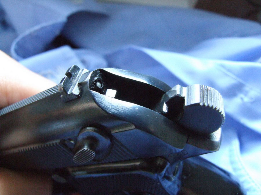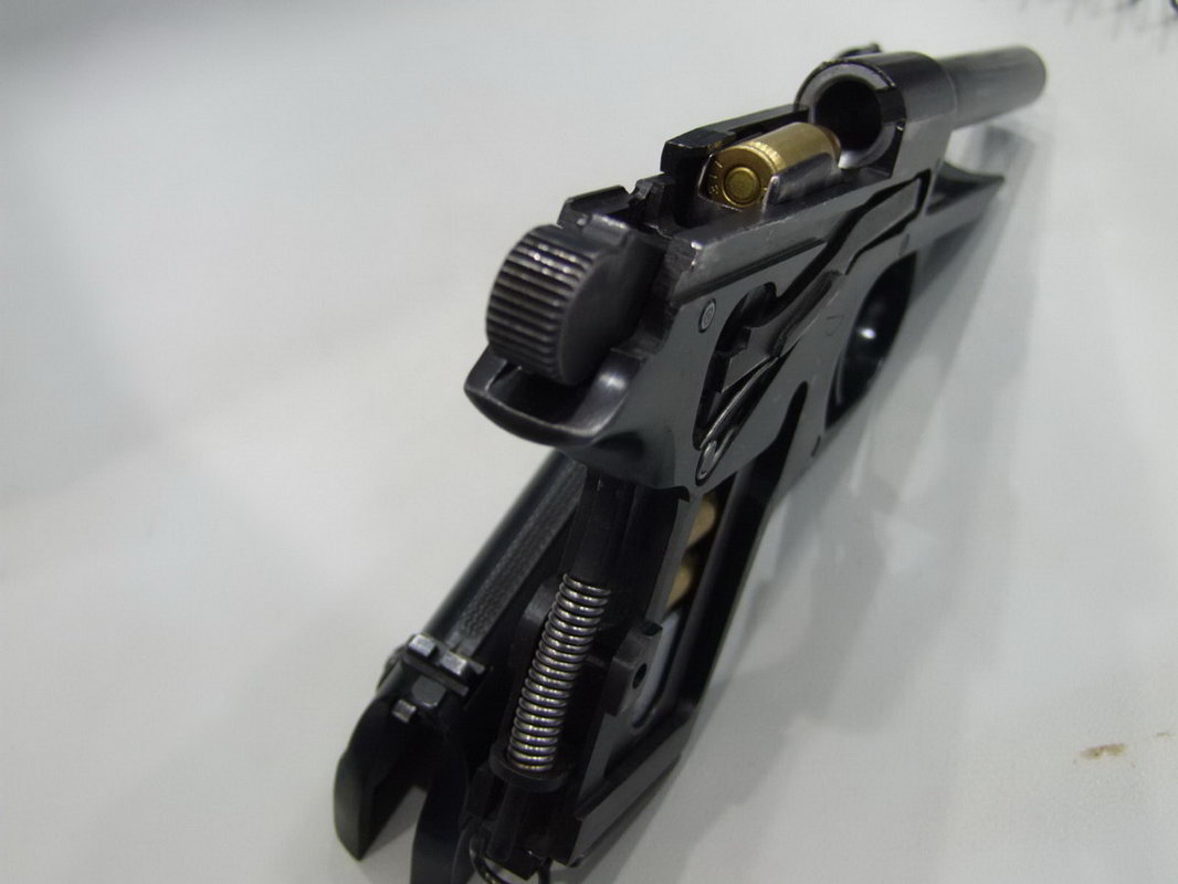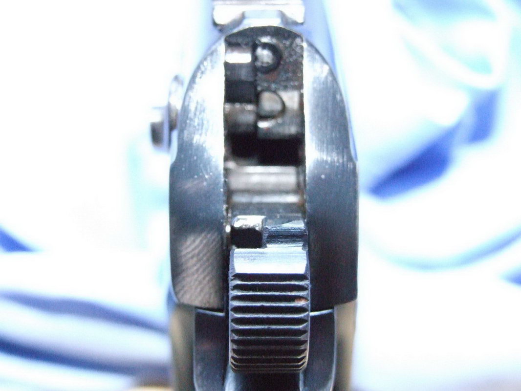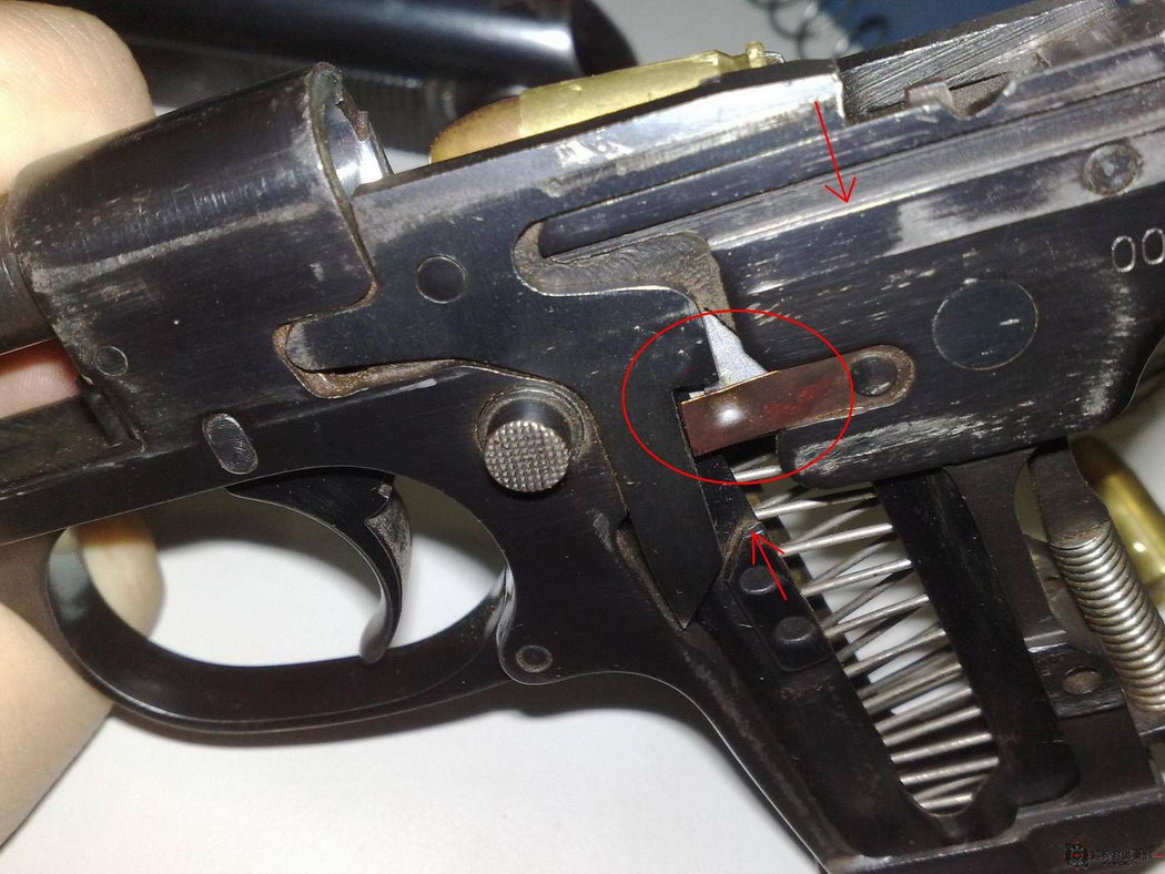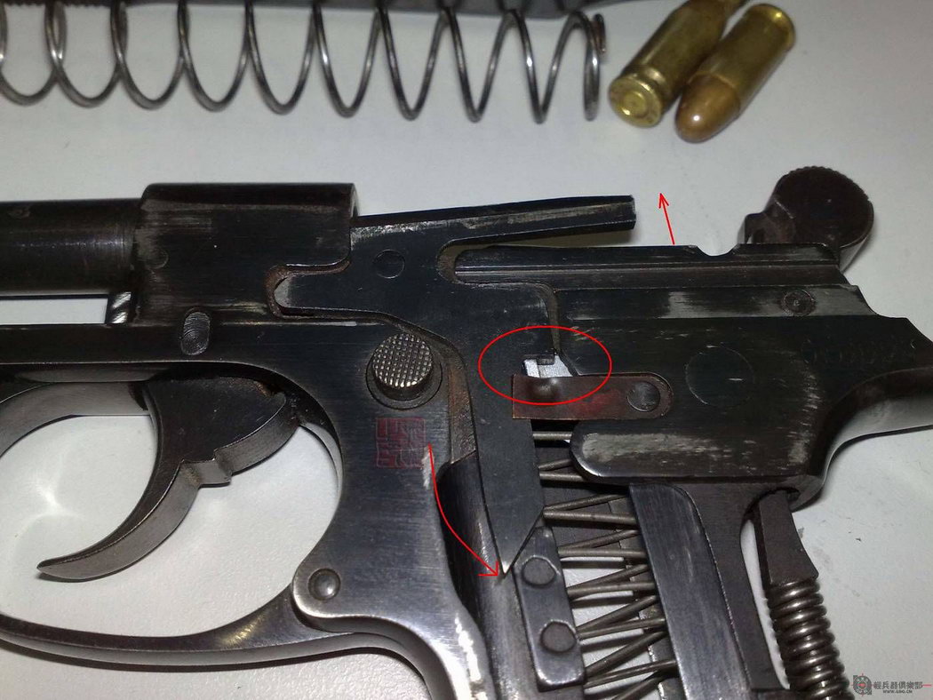 此时观察弹膛部分,会发现里面开有四条螺旋槽,设计此螺旋槽是因64式手枪弹初速较7.65mm手枪弹偏高,而64式手枪设计时套筒重量过轻,在试验过程中发现,套筒后坐速度偏大,其后坐冲量通过枪底把传递到射手手中,使射手在射击过程中感觉震手。为解决这个问题,必须要设法减小套筒后坐时产生的的撞击能量。最简单的办法就是减小套筒后坐的速度。在不增加全枪重量的情况下,在弹膛内部加工了4条螺旋纹槽。枪弹击发后,弹壳在火药燃气作用下膨胀后坐,由于弹膛内加工了螺旋槽,使得弹壳与弹膛内壁的接触面积增大,这样就增大了抽壳阻力,其作用也相当于增加了套筒的虚拟重量,达到了降低套筒后坐冲量的目的。而且在增加弹膛螺旋槽后,由于套筒重量过轻而导致的空仓不挂机故障也解决了,可谓一举两得的创造。