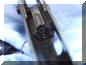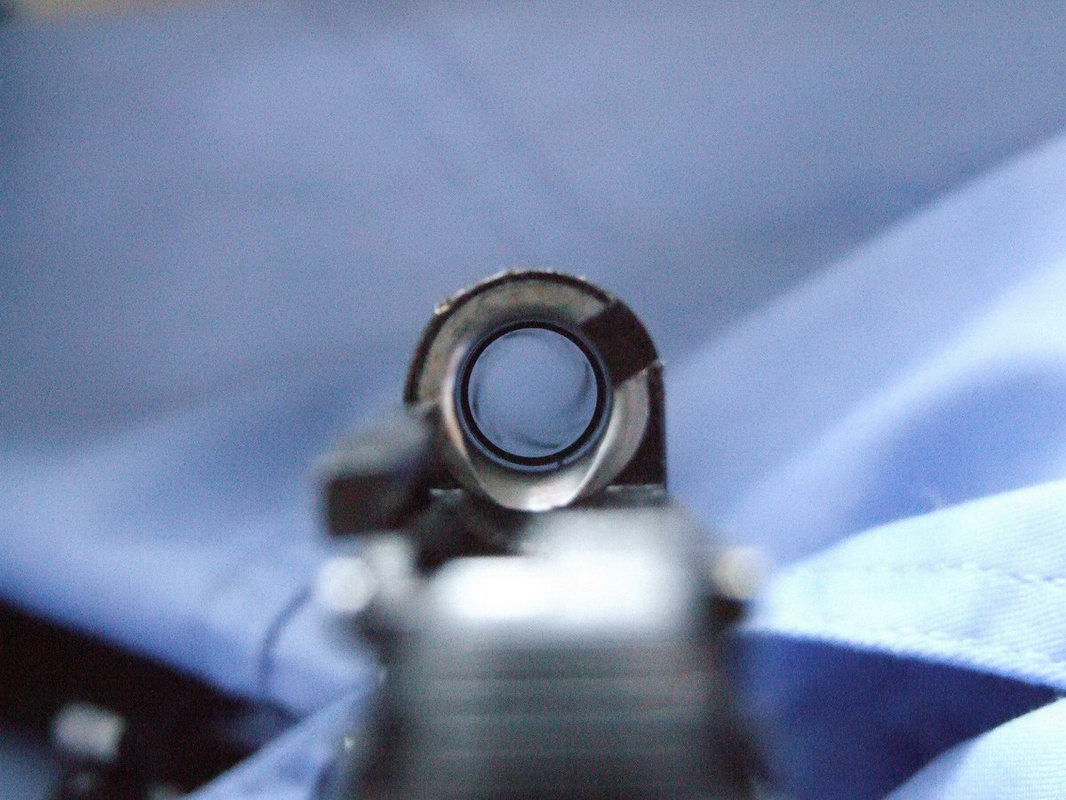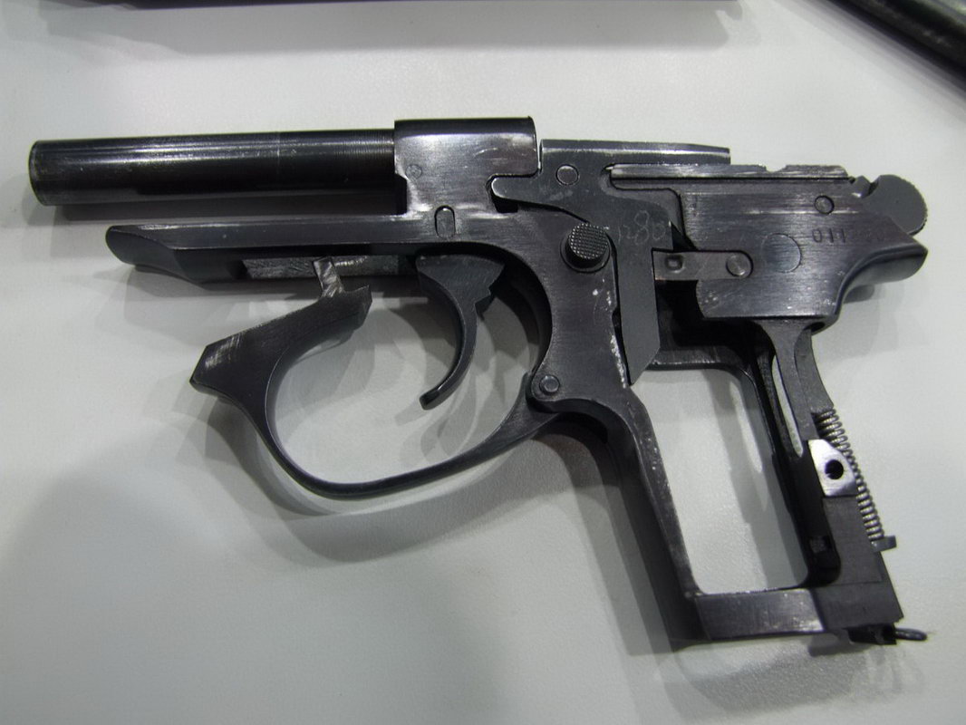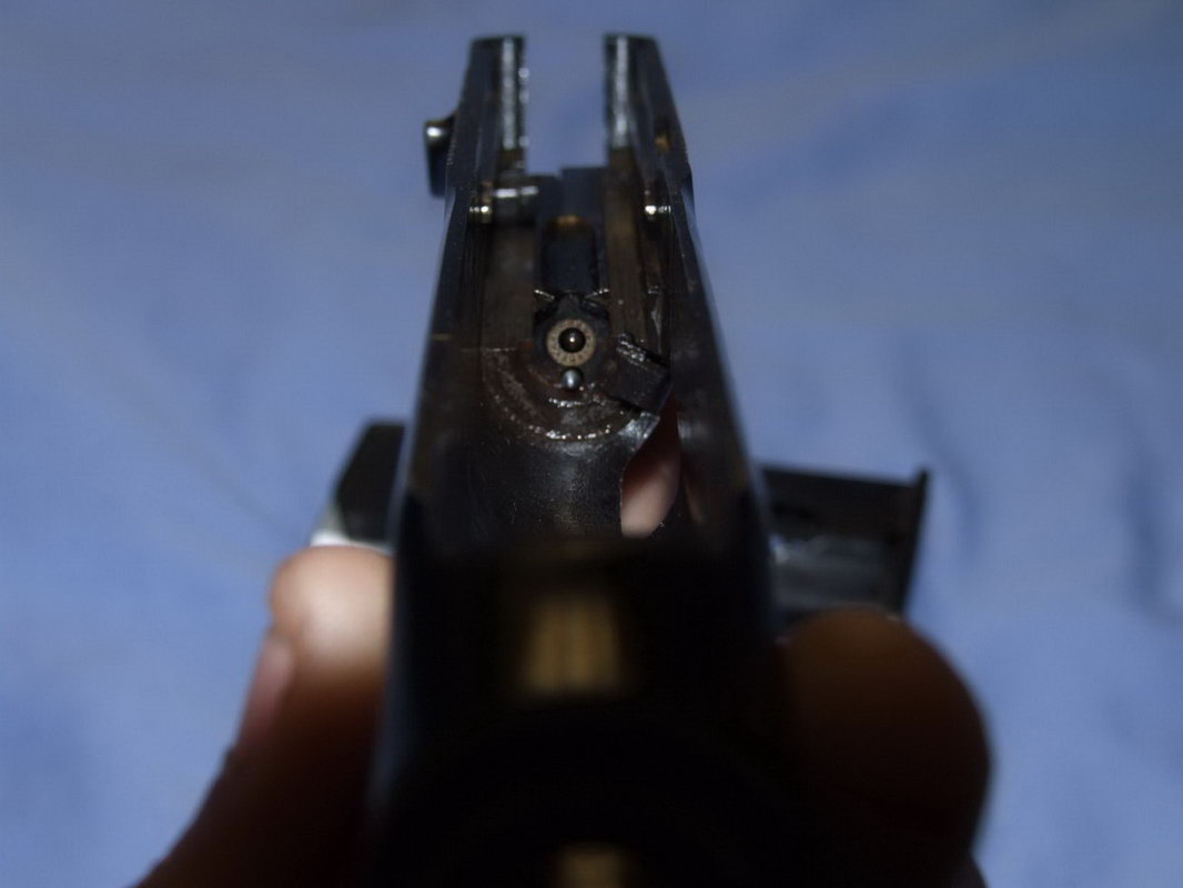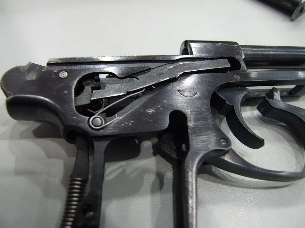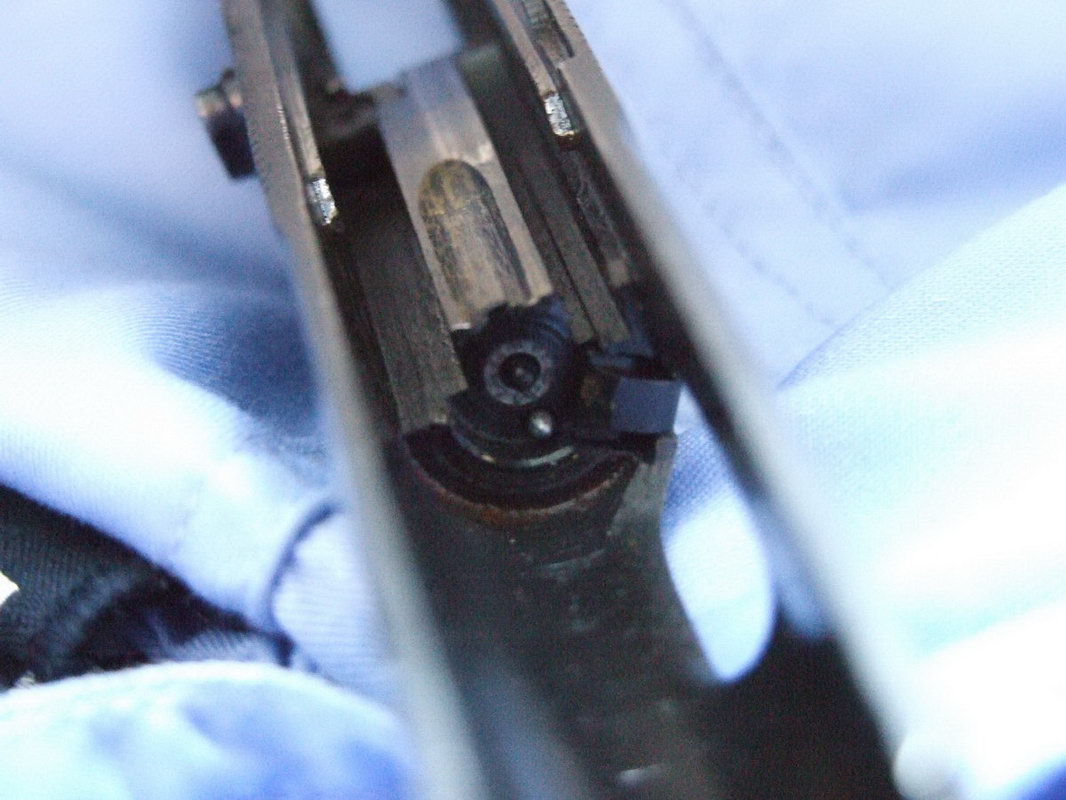 此时观察弹膛部分,会发现里面开有四条螺旋槽,设计此螺旋槽是因64式手枪弹初速较7.65mm手枪弹偏高,而64式手枪设计时套筒重量过轻,在试验过程中发现,套筒后坐速度偏大,其后坐冲量通过枪底把传递到射手手中,使射手在射击过程中感觉震手。为解决这个问题,必须要设法减小套筒后坐时产生的的撞击能量。最简单的办法就是减小套筒后坐的速度。在不增加全枪重量的情况下,在弹膛内部加工了4条螺旋纹槽。枪弹击发后,弹壳在火药燃气作用下膨胀后坐,由于弹膛内加工了螺旋槽,使得弹壳与弹膛内壁的接触面积增大,这样就增大了抽壳阻力,其作用也相当于增加了套筒的虚拟重量,达到了降低套筒后坐冲量的目的。而且在增加弹膛螺旋槽后,由于套筒重量过轻而导致的空仓不挂机故障也解决了,可谓一举两得的创造。