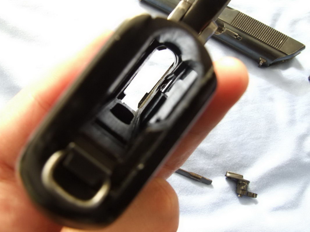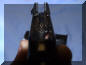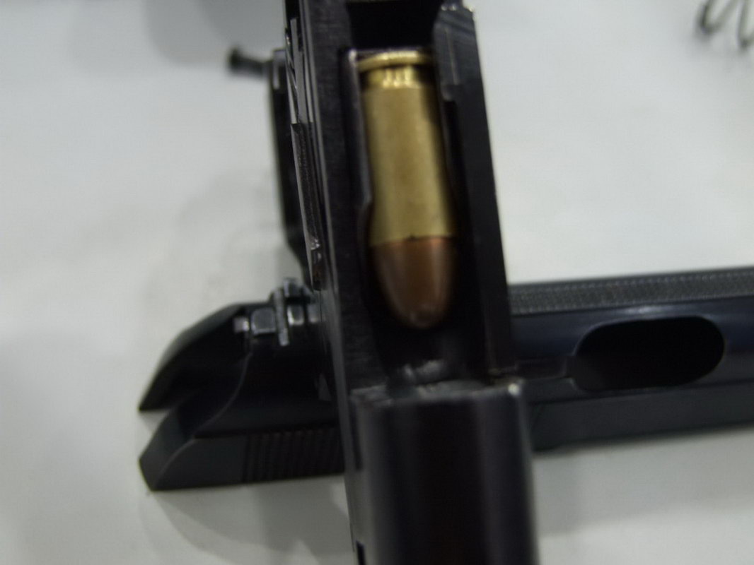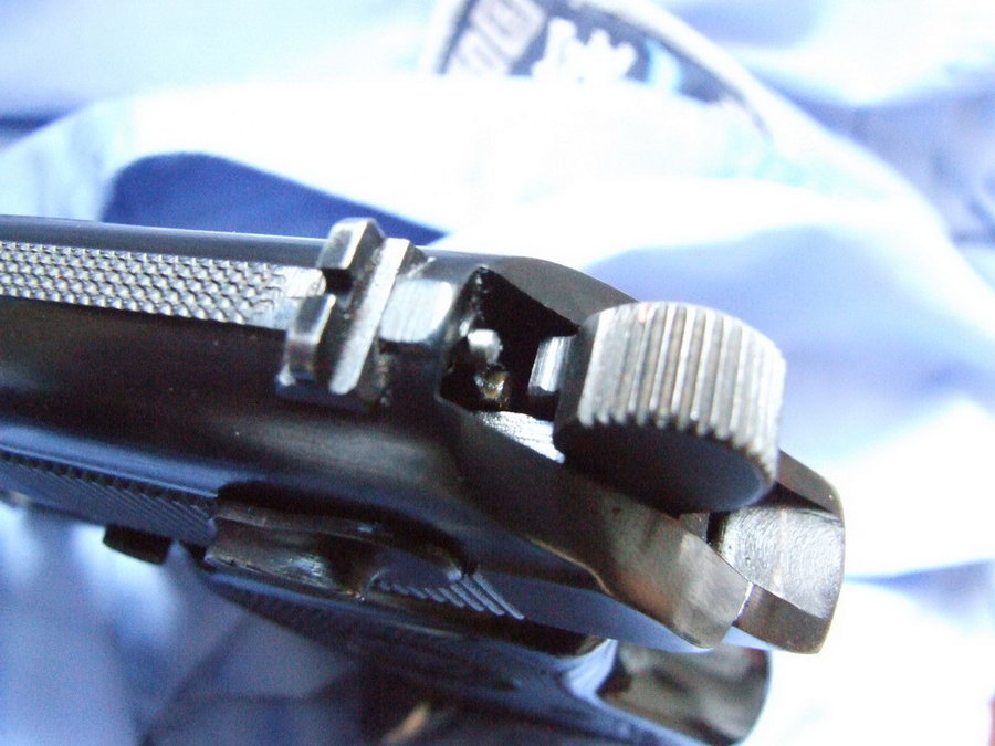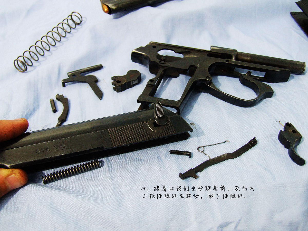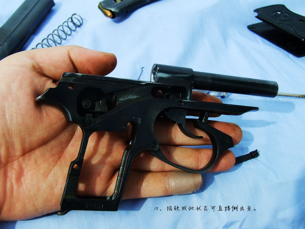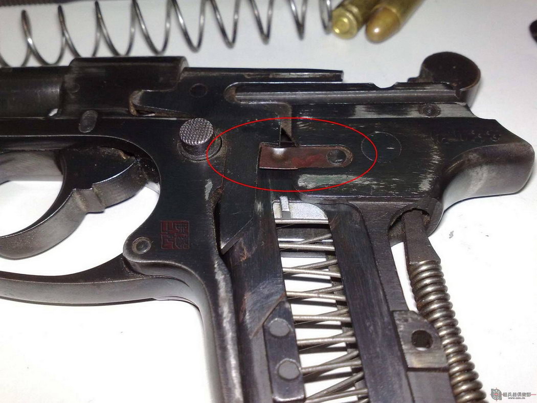 用拇指轻轻拨动位于套筒左侧的手动保险,发现与52式的设计刚好相反——往上扳动是保险状态,而往下拨动则是射击状态,这样的设计很是顺手,毕竟往下拨动保险要方便得多,也不易脱手。将手动保险扳动至保险位置时,击锤便自动释放,值得注意的是,此时击锤并未接触到击针,所以这个过程是安全的。而实现这一功能则是靠击锤上的半缺口下方凹槽和保险顶端的突出结构相互配合实现的,且在安全释放击锤的同时锁住击锤、套筒、扳机。在保险关上后,套筒不能拉动、击锤无法扳倒、扳机也扣不动,笔者认为这是个极成功的设计。