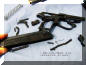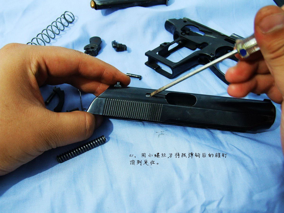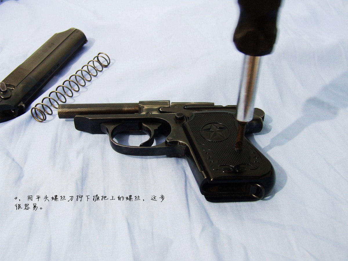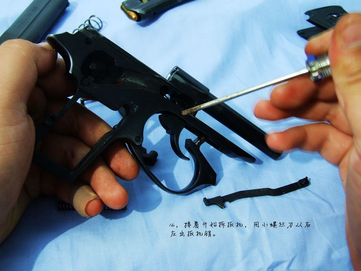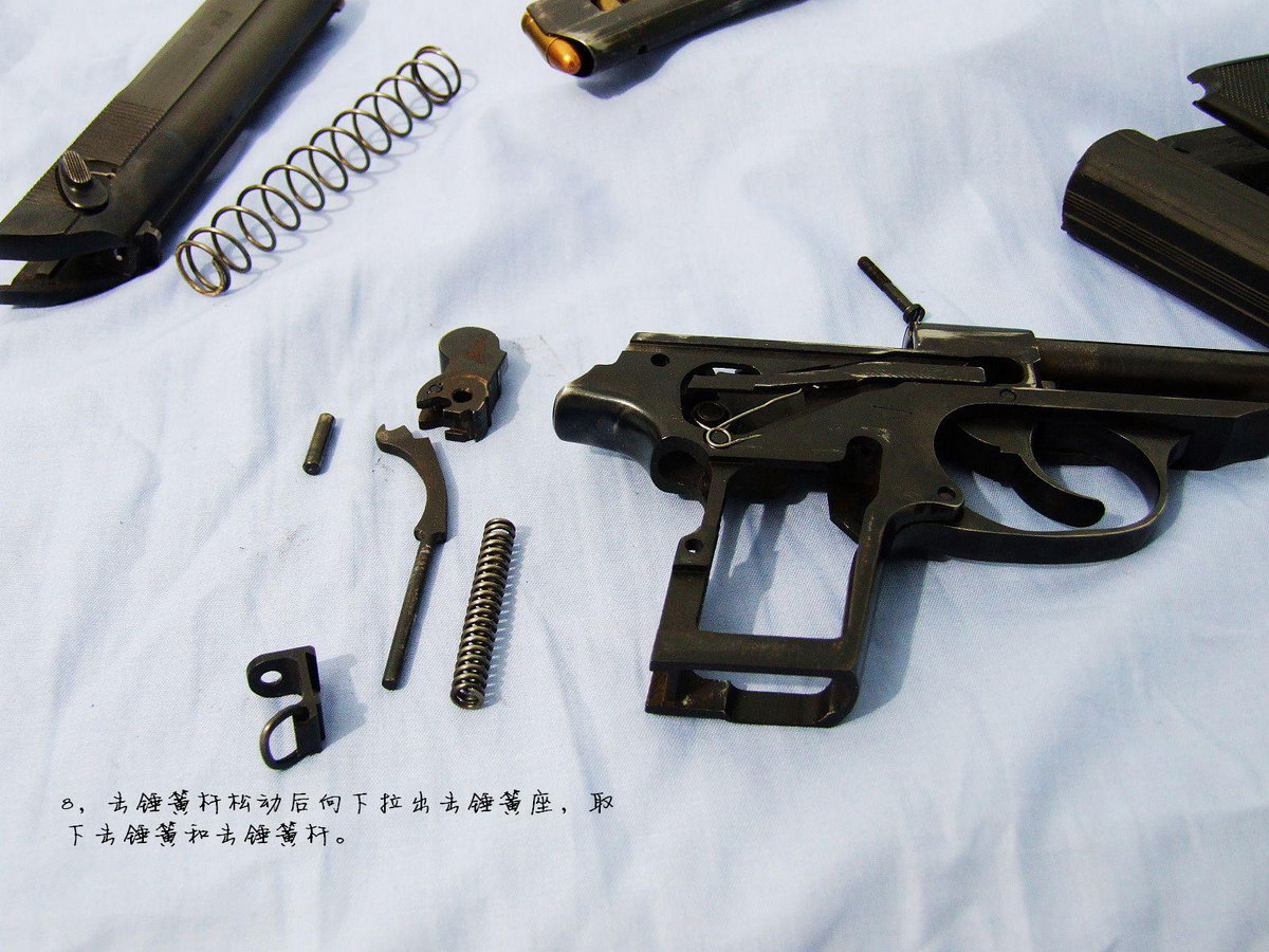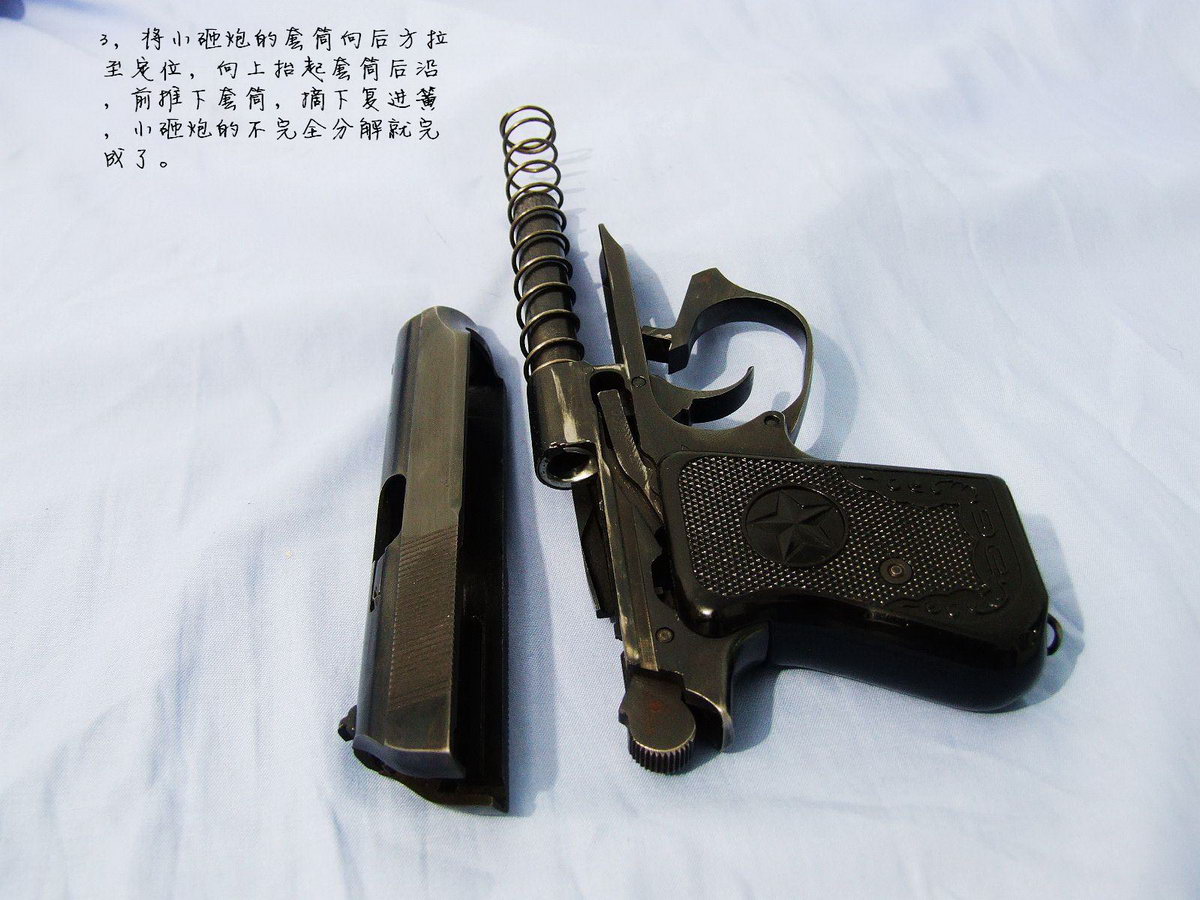 64式手枪不完全分解无需工具,徒手即可完成。如果要完全分解的话,也仅需一把镊子和一把平口螺丝刀,无需专用工具。枪支在分解前,需先退出弹匣,然后拉动套筒确定膛内无弹,这也是必须要养成的好习惯。在验明膛内无弹后,将扳机护圈向下拉动直至解脱,然后将扳机护圈向左或向右板,使其抵在套筒座内的扳机护圈槽内。随后将套筒向后拉至最大限制位后向上抬起套筒后端,再将其向前推出,然后将套在枪管上的复进簧取下,64式手枪的不完全分解即可完成。