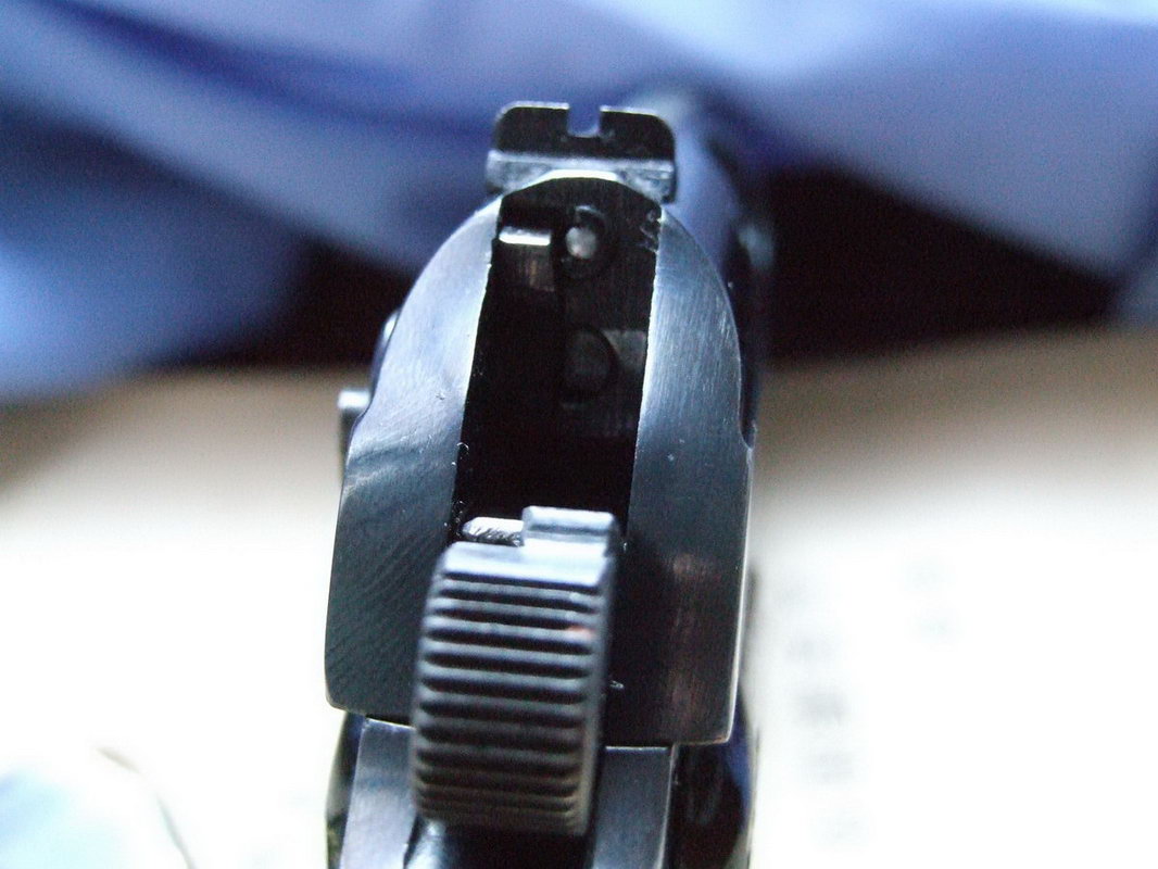 套筒上方、照门和准星之间加工了一道贯穿整个套筒表面的滚花纹,其目的是为了防止套筒表面反光对射手的干扰。扳动击锤至待击位置,露出了击针和击针上方的膛内有弹指示器。当弹膛内装有子弹时,子弹底部将膛内有弹指示器推出套筒尾部,瞄准时用眼睛的余光便可看到。如果是夜间,也可以用手触摸确定膛内是否有弹。如果退出膛内的子弹,膛内有弹指示器便在弹簧的拉力下缩进套筒内。