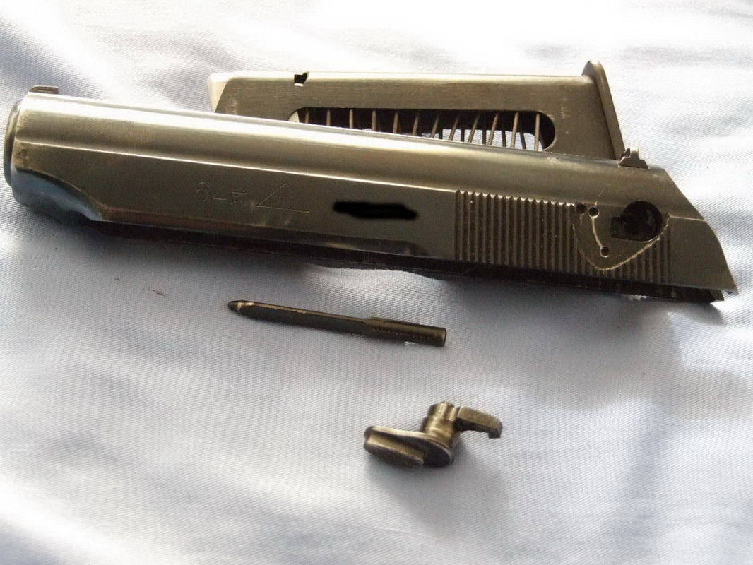 由于在设计过程中秉承了一件多用的设计理念,该枪日常分解保养时仅需分解成四大部件。如该枪的枪管兼具复进簧导杆的功能,复进簧直接套在枪管上。而握把护板则是一个独立的部件,不像一般的手枪分成左右两半,仅需卸下一颗螺钉便可将其拆除。击锤簧座的下方则加工成环状,从握把底部突出来,作为枪纲挂环使用。64式手枪设计最为巧妙的应该是抛壳挺了,除具有抛壳功能外,同时还兼具空仓挂机功能。该枪的弹匣底盖和枪底把下平面的间隙有1.2~2.6毫米,装入实弹匣后,用力将弹匣向上拍到位,弹匣左侧的突起(近似于梯形)的斜面,顶住抛壳挺,迫使其顺时针回转,解脱空仓挂机。在弹匣底盖没有受力的情况下(如正常射击中),由于托弹簧力的作用,弹匣保持在下方位置。因为有上述间隙,弹匣侧面的突起与抛壳挺不起作用。弹匣打空时,托弹板将抛壳挺后端顶起(从左侧看,逆时针回转),形成空仓挂机。除了上述方法外,也可在装入实弹匣后用手拉动套筒再释放的方法解脱空仓挂机。