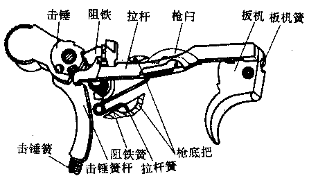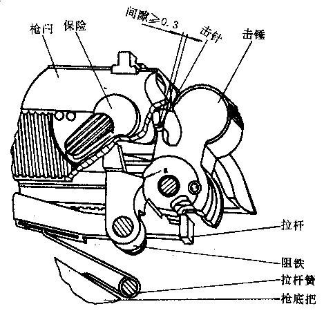 自动保险:如果不扣压扳机,使扳机拉杆向前行动的话,即使击锤被意外释放,最终也会被阻铁待击齿顶住,使击锤撞击面与击针尾端面之间有不小于0.3mm的距离,而无法击发底火