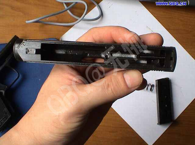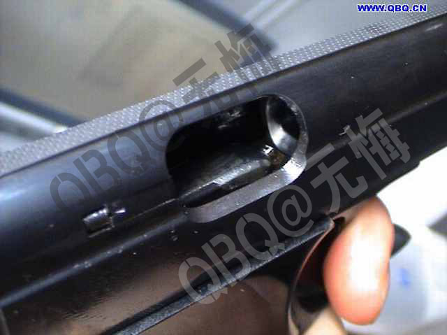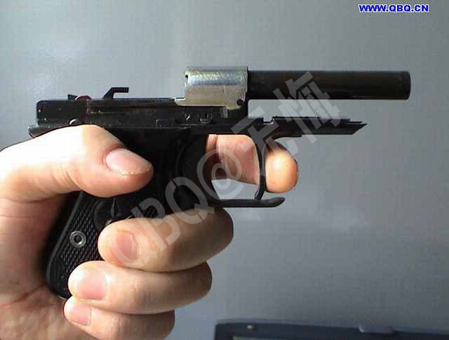 (八)短小的握把。 77体积较小,和64一样,由于在设计过程中没有考虑到设计相应的指托,手较大的射手在使用时只能将小指蜷曲在弹匣底部,甚至还有射手要翘起“兰花指”来射击。而很多国外的小型手枪均在弹匣底部设计了指托,如PPK手枪就有这样的设计。塑料制成的指托结构很简单,成本也不高,目前,已有一些厂家小范围制作64、77的通用弹匣指托。