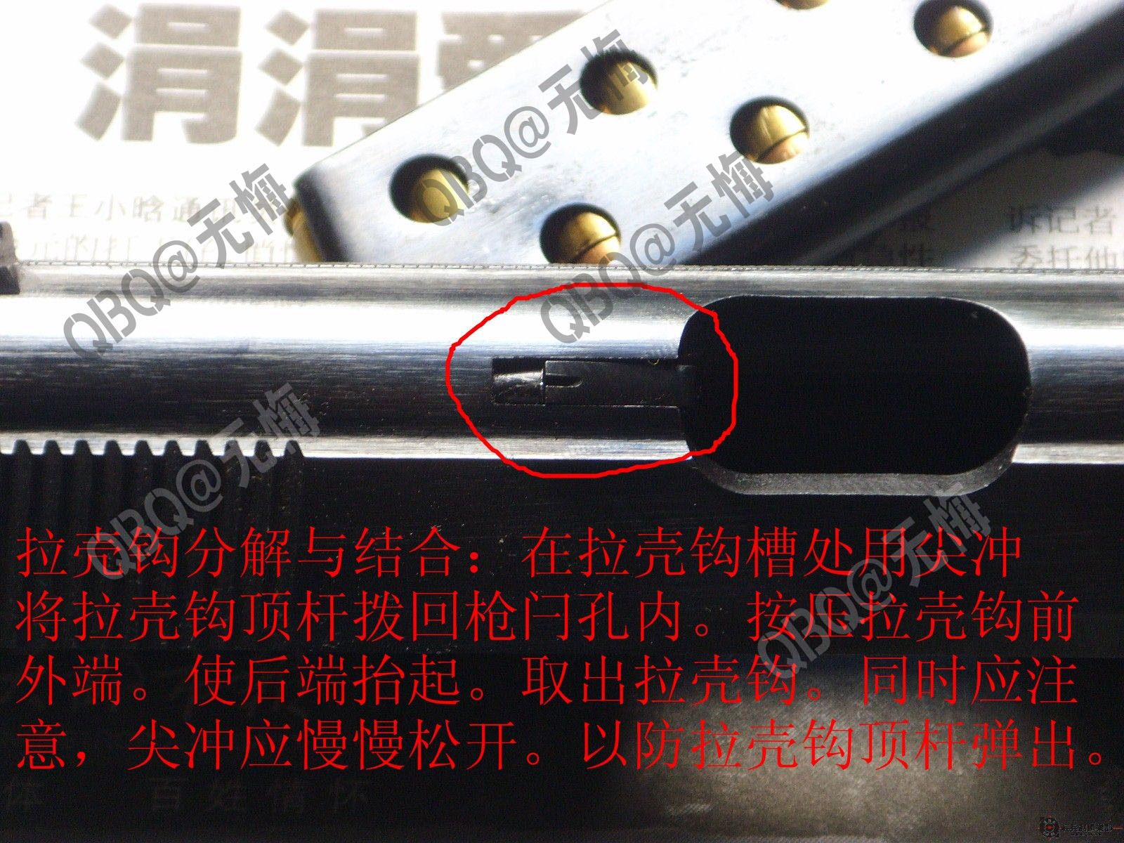 站长本人十多年前第一次尝试77式的单手上膛时,因为没掌握到用力的技巧而失败,套筒只能扣到一半