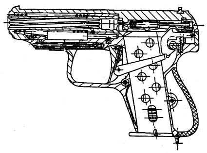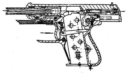 上世纪初,研制具有单手上膛功能的口袋手枪成了一种时尚。1913年,德国枪械设计师维托尔德·切尔列夫斯基(Witold Chylewski)设计了世界上第一款活动扳机护圈的扳机护圈待击系统(Einhand<德语应该是“一只手”的意思>),并在奥地利申请专利。“一只手”系统可让使用者以一根手指头的力量,通过向后扣动连接着套筒的扳机护圈前部,令子弹上膛。整体工作为:扣动扳机护圈,套筒向后运动,并且令复进簧向后收缩。当扳机护圈获得释放时,套筒会返回到位并且将子弹上膛,扳机护圈则会在前方自动锁定,防止正常射击过程中压伤食指。该系统的优点在于不仅可以上膛,在出现哑弹后可迅速装填新弹。