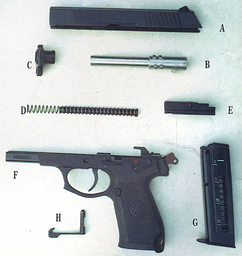A套筒;B枪管;C枪口帽;D复进簧及导杆;E连接座;F击发机构及底把;G弹匣;H挂机柄