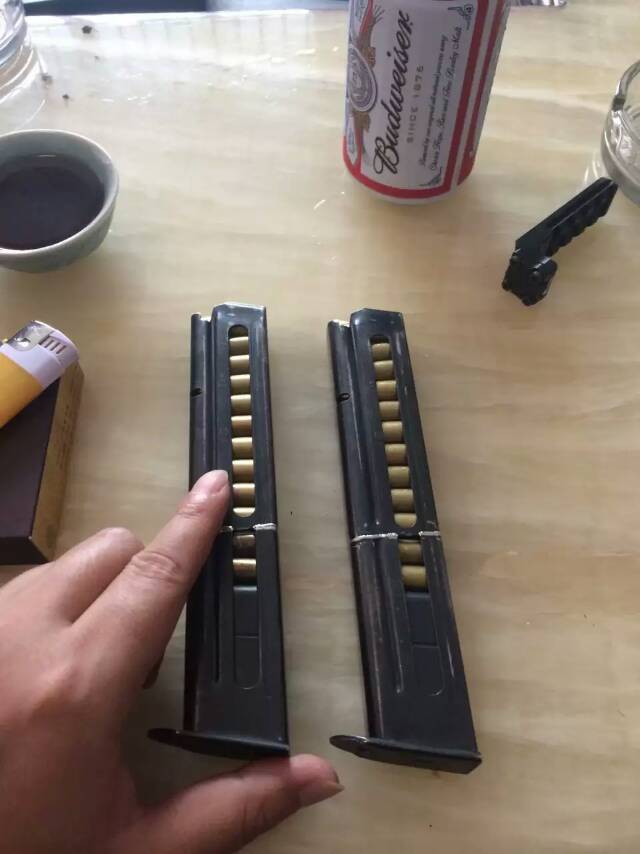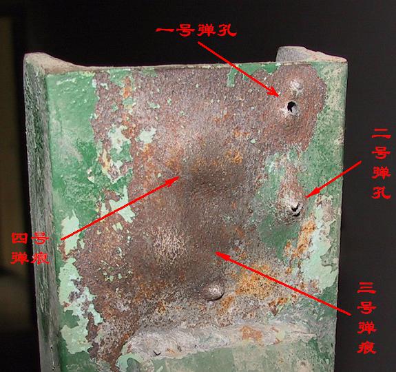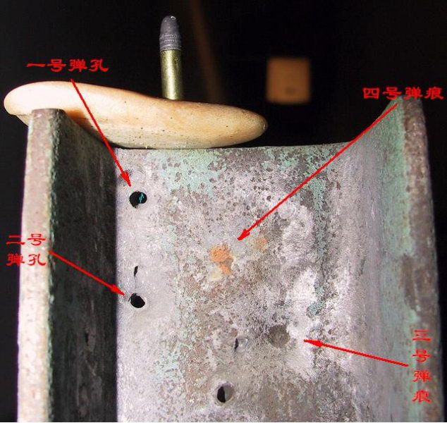 穿孔的为DAP92式9mm手枪弹击穿的,凹印为普通9x19mm铅芯弹的痕迹
