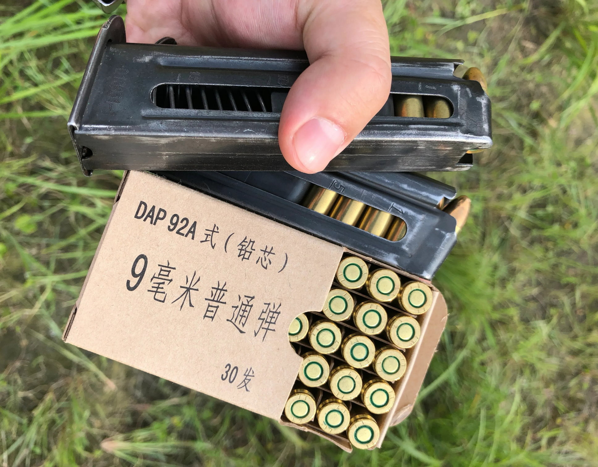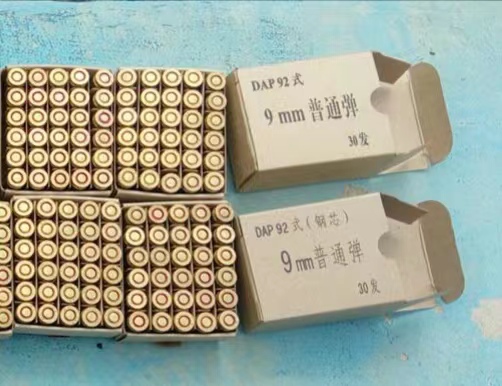 DAP92式9mm手枪弹全弹长30mm,全弹重12.3g,弹头重8g,采用制式的无锈蚀底火,发射药采用单基火药,枪弹速度(V5)为360±10m/s。在25m的距离上,射弹20发。R50≤25mm,R100≤65mm。虽然资料上称DAP92式9mm手枪弹可与9mm派弹通用,但实际上,92式手枪使用9mm派弹问题不大,但9mm派弹口径的手枪使用DAP92弹却有可能出问题,这是因为DAP92弹故意设计得比标准的9mm派弹略长一点点。虽然大多数手枪的设计都考虑了公差的问题,而且不同厂家生产的9mm派弹都有不同的尺寸偏好,但超过一定的公差就可能出现供弹故障。以美军的M9手枪为例,标准军用弹的弹长为29.5mm,当弹长为29.7mm时,可能会出现供弹故障,而DAP92弹则长得多。让92式手枪单方向通用弹药的设计,既符合了军方的要求,又使92式手枪易于外贸。