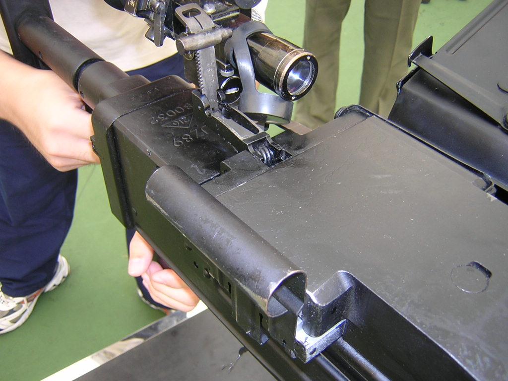 89式重机枪的枪管与机匣连接采用抽拉式固定栓,可快速进行装拆,而且只有固定栓装到位并合上供弹机后才能射击,确保使用安全。