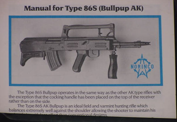 据道听途说回来的传说,86S原本是我国一种无托步枪的试验枪,但北方工业将其发扬光大,研制成为一种外贸枪。由于86S的外形问题,有些人误以为是一种全新的武器,实际上86S只是56式冲锋枪的无托型,各项性能指标也大同小异,只不过86S没有全自动射击的功能。