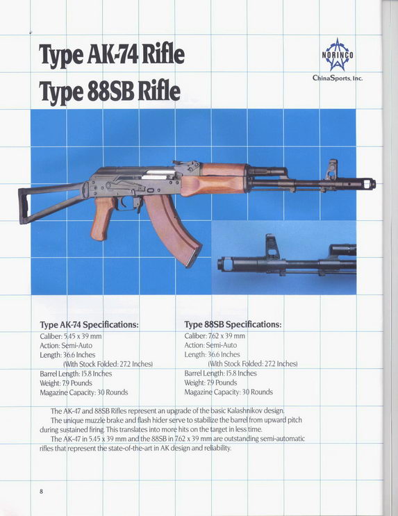 88式实际上是把口径改为俄制5.45mm的56式冲锋枪的出口型,但由于只是更改了口径,发射机构仍然是56式(AK-47式的结构),没有增加击锤延迟体,因此不能完全算是AK-74的仿制型。其中包括可全自动射击的88式和只可半自动射击的88S式民用型。