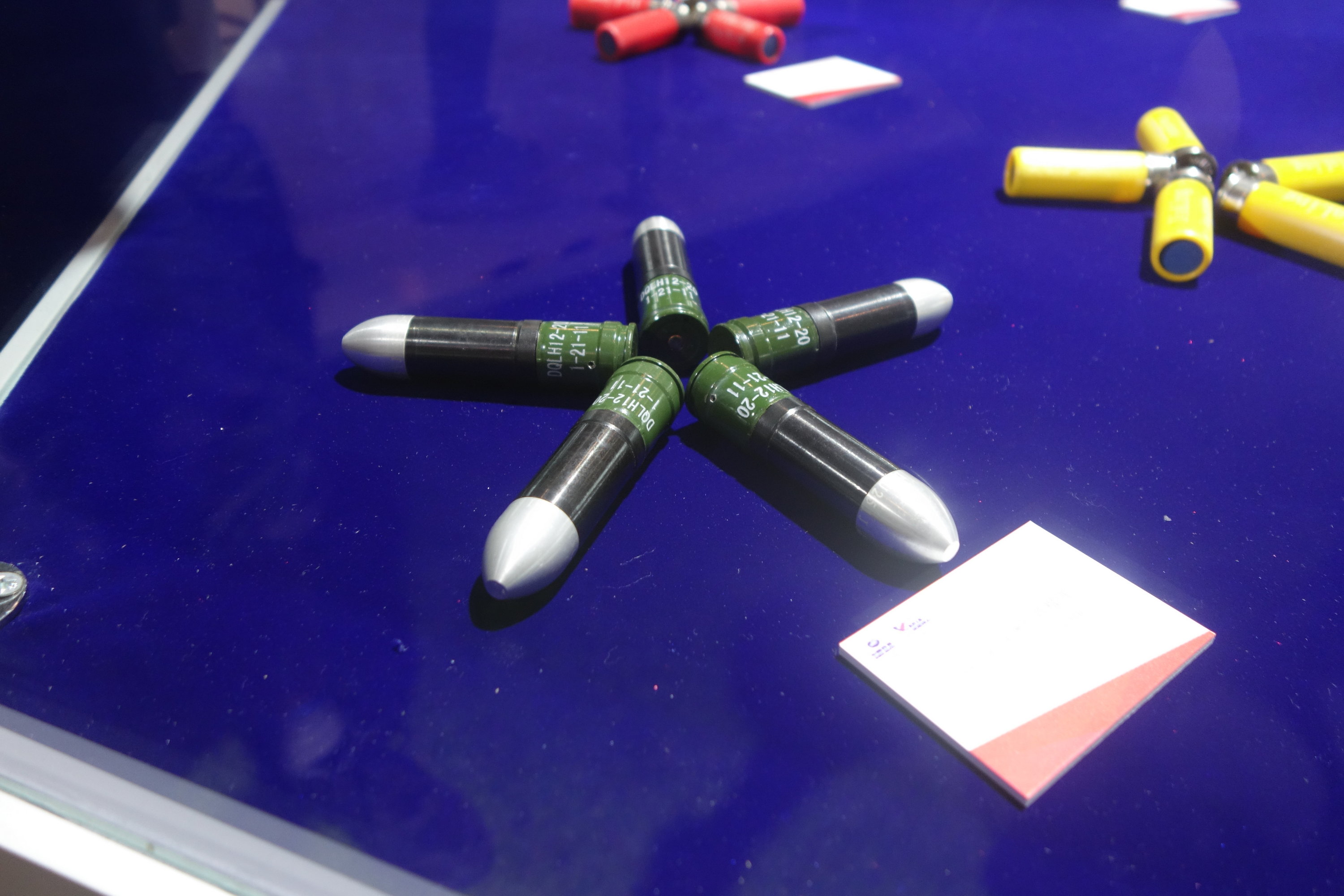 1X式单兵系统之所以称为“步榴霰合一”,是因为它不只是像OICW那样由小口径自动步枪和小口径高初速榴弹武器组成,其榴弹武器除了发射编程引信的空炸榴弹外,也能发射另一种编程引信的榴霰弹。这种榴霰弹其实就是把已经成熟的35mm高炮的AHEAD弹缩小成20mm口径,其使用方式和空炸榴弹一样,通过武器上的火控系统设定引爆距离后,把含有弹丸和二次发射药的弹托发射出去,飞到设定的距离时,二次发射药点燃,扇面喷射出许多弹丸。