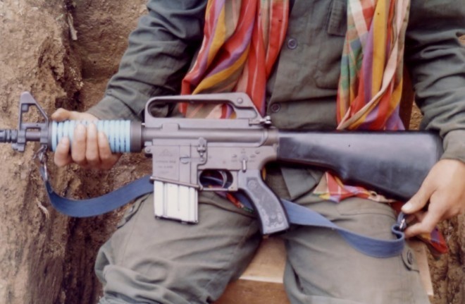 这可能是世界上第一张在用中的CQ311的照片,时间是1992年,缅甸各地方武装召开了一次促进合作、停止少数民族之间战争的大会,TFB的Claymore当时是克伦武装的顾问,他看到一位自称16岁的克伦族士兵携带了这把看起来有点奇怪的AR,认出下机匣上的铁三角标志。回到美国后,Claymore把这张照片给了COLT的军事市场部。这么短的枪管,我猜测可能是换了一个旧的CAR15冲锋枪的上机匣。