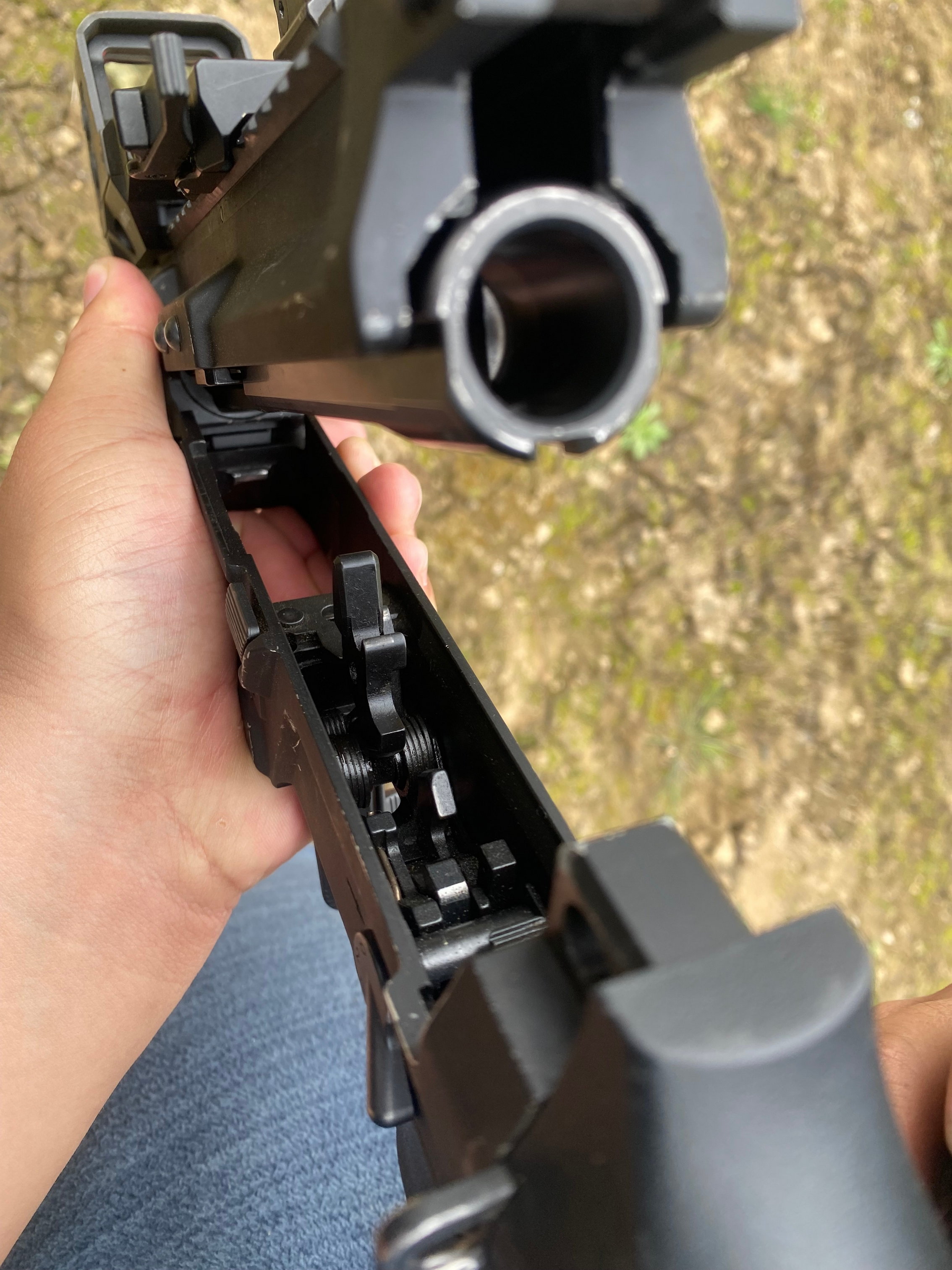 护木前露出的导气箍前方有个小环,应该是气体调节器,使用时,把枪弹的颈部伸这个环内可以充当扳手。消焰器类似95式,是外部有加强筋的喇叭品型消焰器。有些高清图中看出握把底部有个盖子,应该是存放维护工具的附品筒的。枪托为伸缩式,不能折叠,伸缩长度也只有一半,这是由于复进装置是装在枪托内。