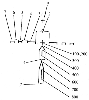 分划板刻线具有概略测距和装定瞄准角两个作用。分划板上呈左右对称的水平刻线可实现概略测距, 当目标宽度为0.5m时(如人体肩宽),可概略地测定目标距离。 图中各数值(单位:100m)所指不同线段或线段间隔 的长度,对应于宽度为0.5m时目标的不同距离。垂直刻线和“∧”形线表示出不同距离的瞄准角。 依据不同的目标距离,直接选用对应的瞄准点标记进行瞄准。瞄准镜配于自动步枪时只使用600m以内的分划;配于班用机枪时可使用全部分划。