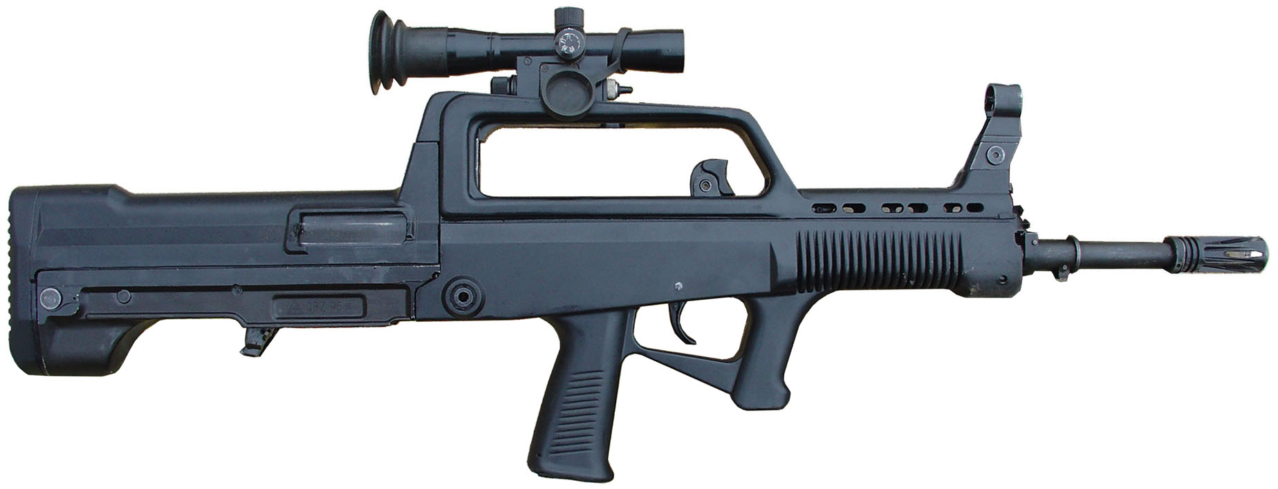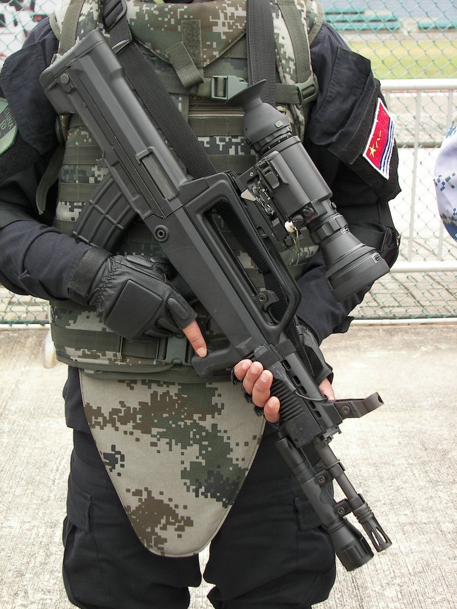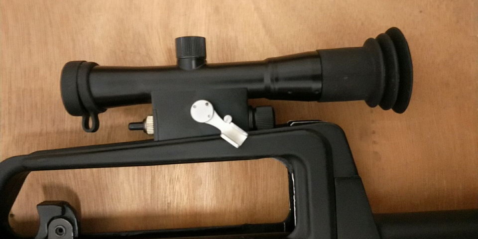 为95式枪族研制的白光瞄准镜可通用于自动步枪或班用机枪上,用于对600-800m内的目标实施瞄准射击和战场观察,当目标宽度为0.5m时,可概略地测定目标距离,并具有夜间分划照明功能。