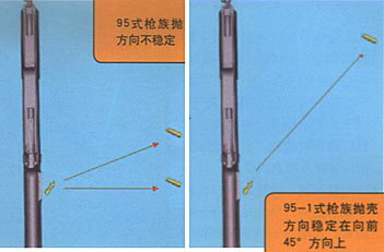 虽然原来的95式枪族是向右前方抛壳的,但并不稳定,每几发就会出现一次横向甚至向后抛壳的情况。95-1改进了抛壳机构,将抛壳口后沿向前缩进5mm,使抛壳方向稳定在右前方45度方向,提高了抛壳方向和路线的稳定性和一致性。