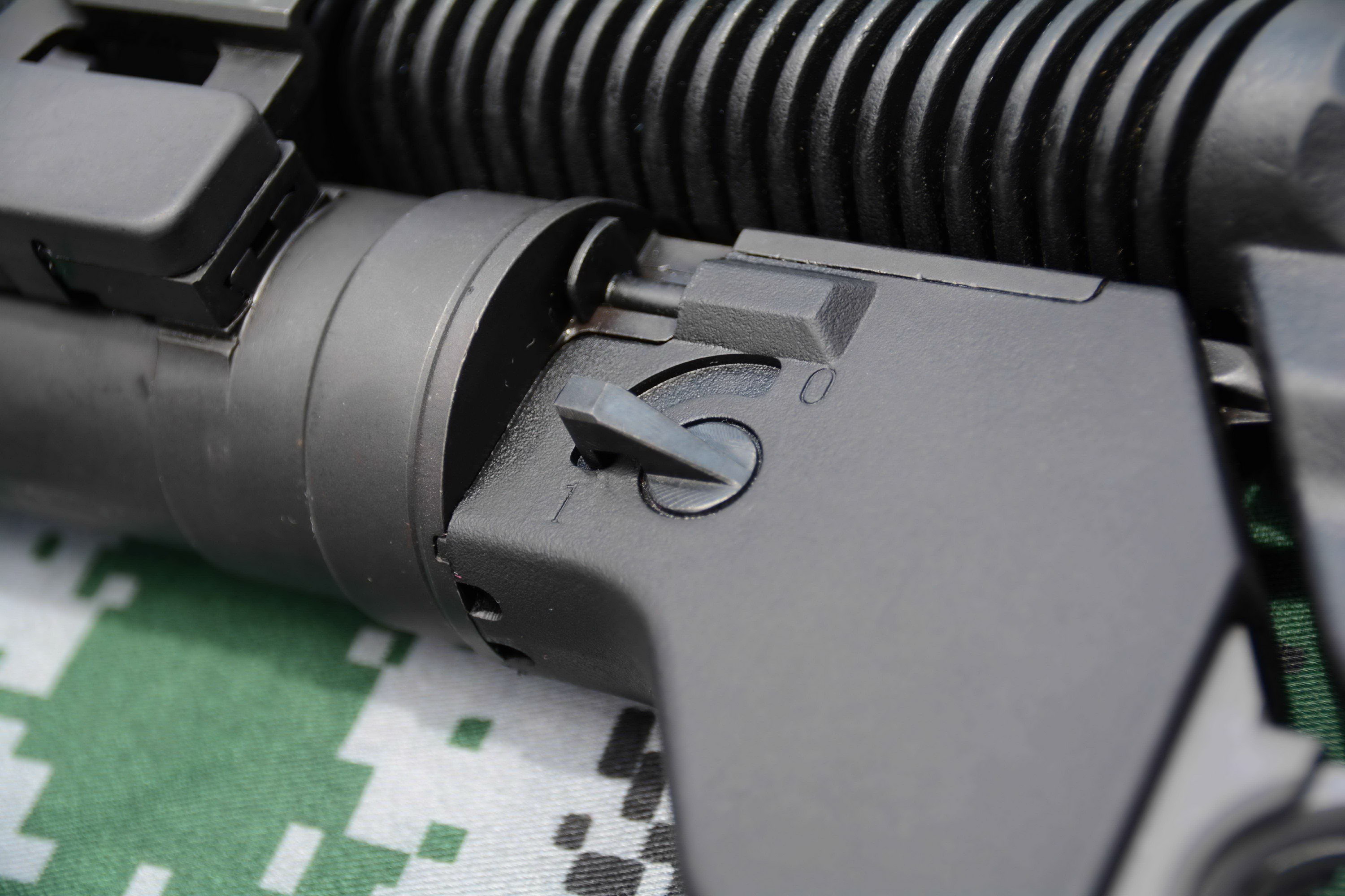 握把的夹角由81°减小至75°,后端向前移了3.5mm,便于让榴弹发射器的扳机能共用步枪的握把,也让装卸弹匣时的前部空间更多。