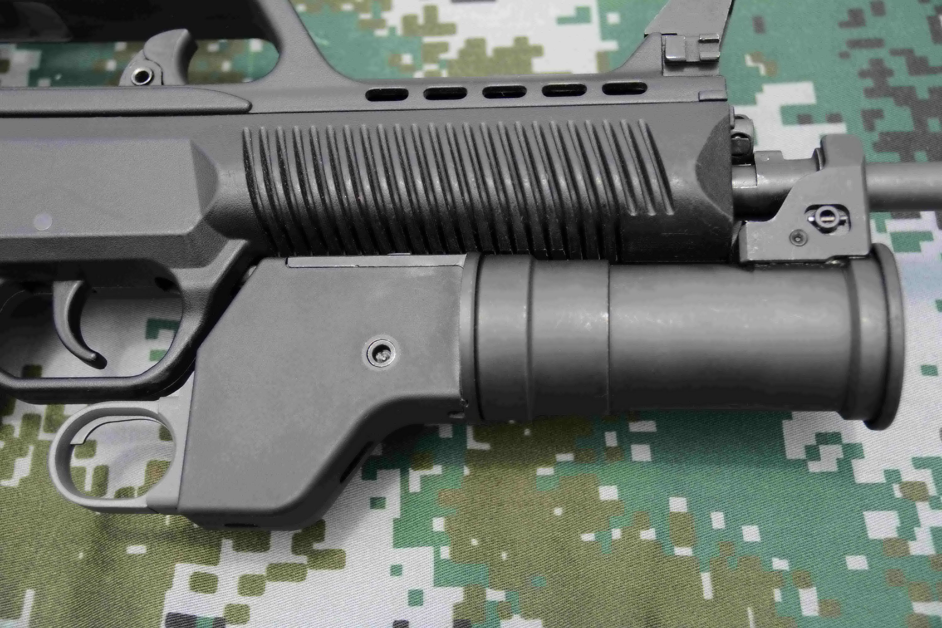 增加前装式的35mm枪挂榴弹发射器。原本的91B式35mm榴弹发射器只配有防暴弹,这次的前装式榴弹发射器(明显是参考了GP25的设计)则配用了杀伤榴弹。