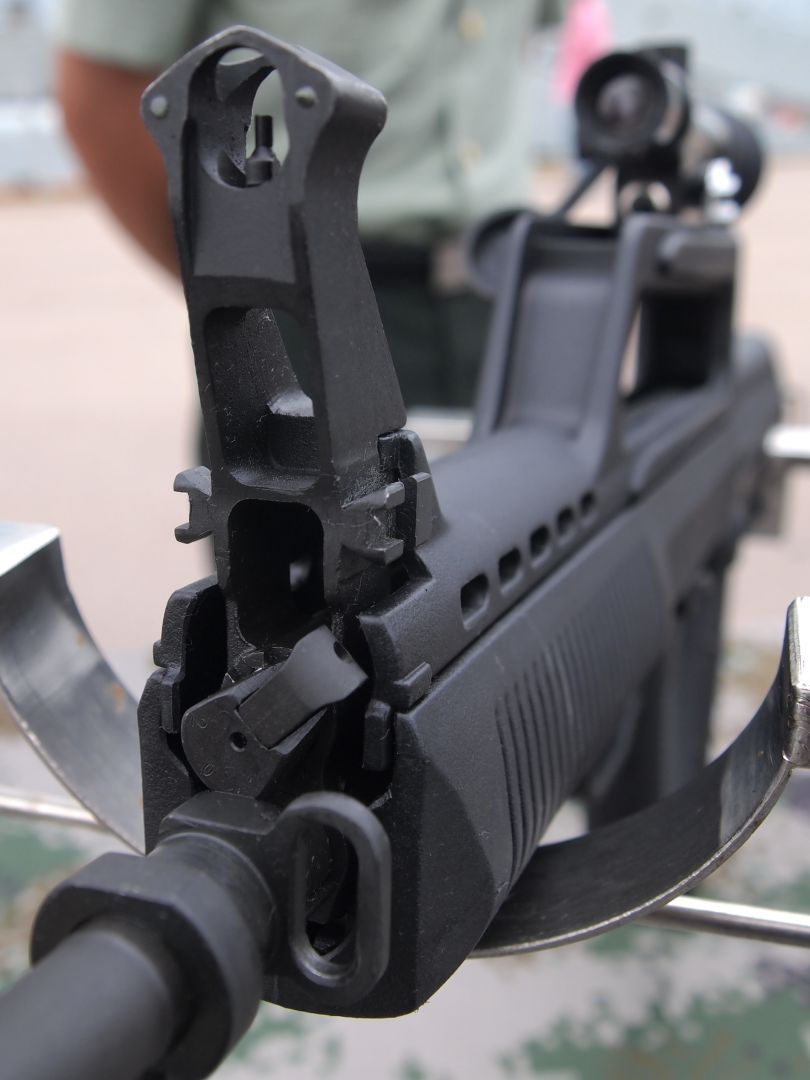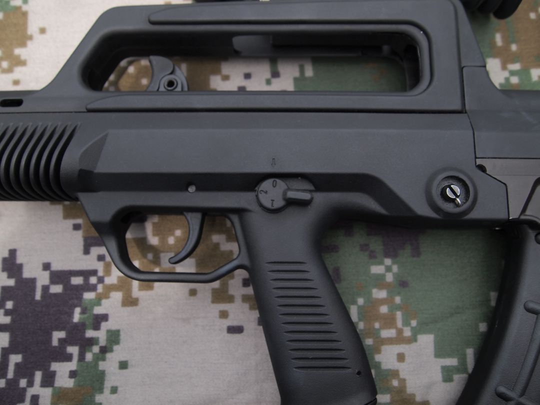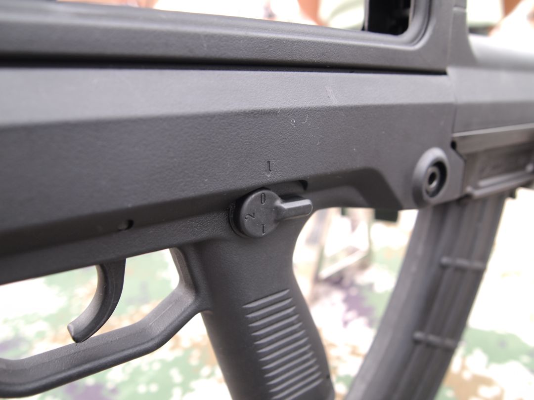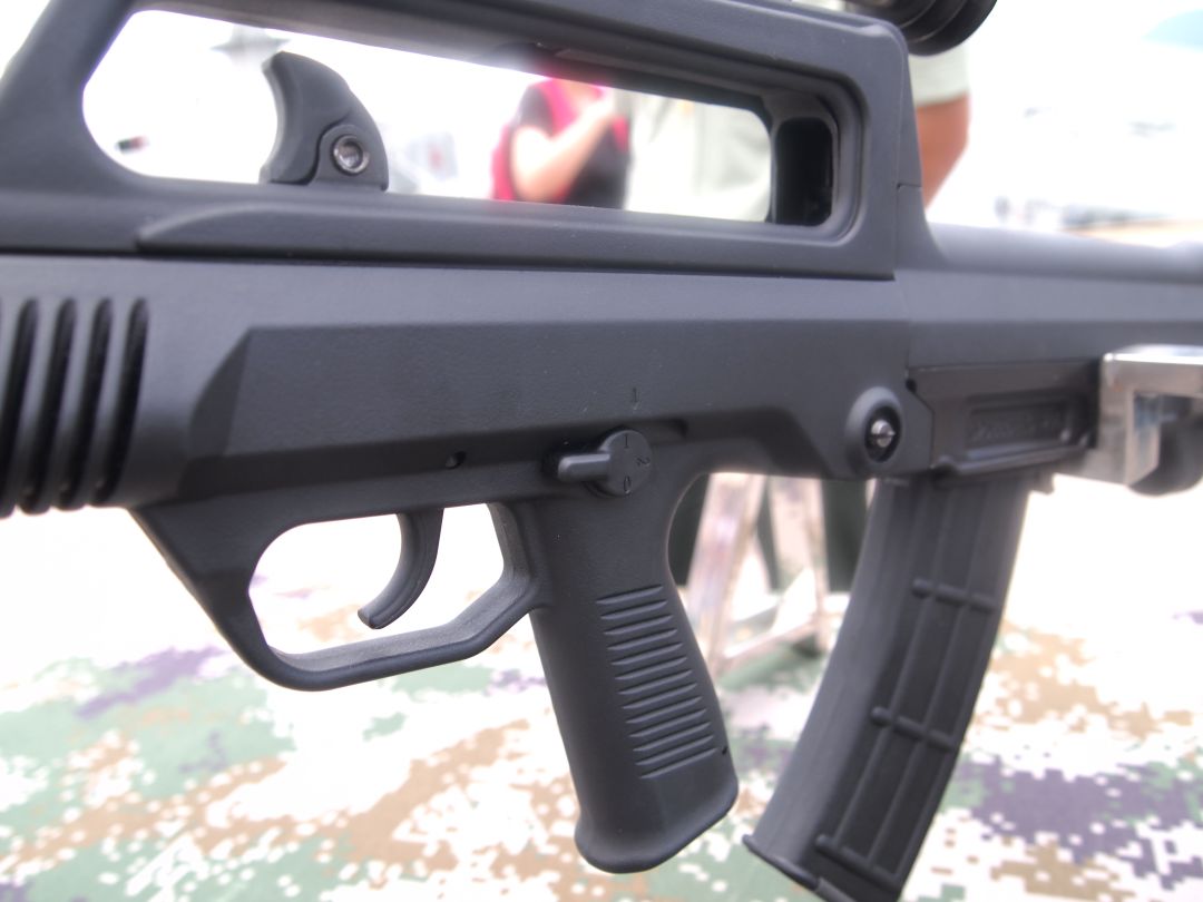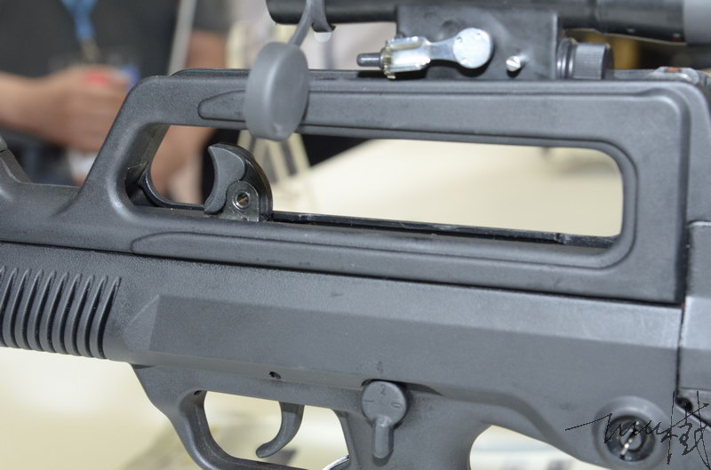 保险/快慢机柄改到握把左上方,可由拇指操作,实现保险到连发的快速转换。但前面提到的那位射击教员在文章中提到他试过后认为右手拇指使不上劲。我估计原因是因为这个快慢机柄的位置要迁就枪的外形和内部结基本不变,不得不放得比较低,而像以色列的TAR-21因为一开始设计时就考虑用右手拇指去操作,因此位置就能相对高一些。有试用过的人反映,右手不离开握把位置的话,拇指能拨到连发位置,但要拨到单发位置就比较吃力。所以我认为95-1在这方面的改进只能算是“满足用户表面要求”,而没有“达到用户的潜在满意”的程度。