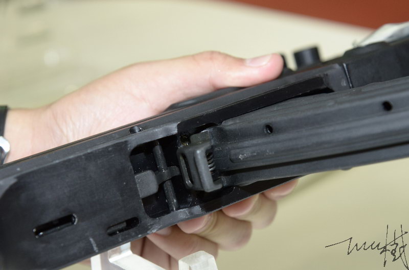 增设空仓挂机装置,因此也同时改进了弹匣的托弹板(但据说旧弹匣仍可通用,只是用旧弹匣时不能挂机),并在弹匣卡笋后面增加空仓挂机解脱按钮。