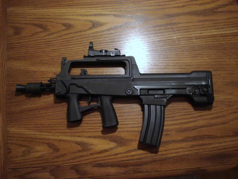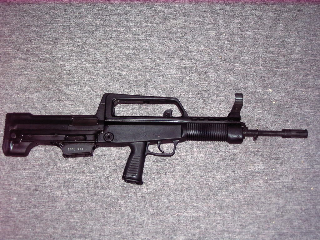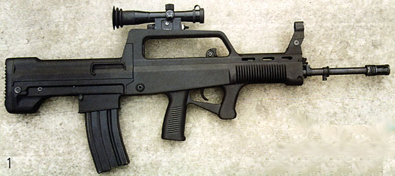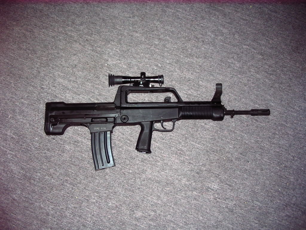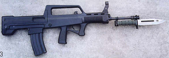 QBZ97式自动步枪(1999年刚公布图片时曾被称为99式,在2000年的刊物上正式称为97式)是QBZ95式自动步枪的出口型,口径为西方国家流行的5.56mm NATO,主要是发射SS109规格的步枪弹。QBZ97整枪特点与QBZ95式基本相同,在外观上最明显的区别是两枪的机匣外形和弹匣。97式在供弹具的位置上有一个向下凸出的接口,而95式比较平坦;97式的供弹具是直插装卸、侧面卡制的4179标准“直弯直”型铝合金弹匣,即M16标准的弹匣,而95式采用前钩后挂、转动装卸的“全弯”型塑料弹匣。