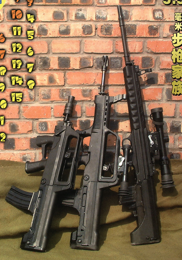从左到右:97式短自动步枪,97式自动步枪,97式狙击步枪(QBU88的5.56mm口径型)
