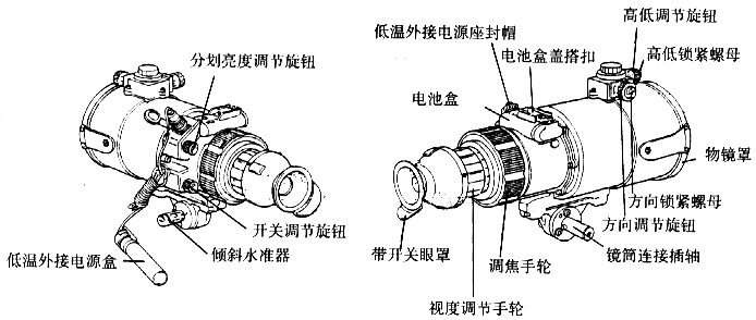 营用微光瞄准镜主要用于在夜间借助微弱的星光和月光进行侦察、跟踪、测距、瞄准。连用瞄准镜由可变闪光电路盒、光学瞄准镜管和俯仰镜体三大部分组成,用于在白天观察、跟踪、瞄准目标。