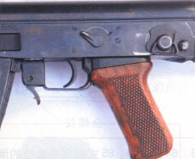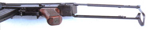 折叠式枪托为开式结构,由左、右支杆,肩托和肩托轴等组成。支杆、肩托由钢板冲压而成。肩托用肩托轴固结在支杆上,且能旋转。当枪托处于战斗状态时,由装在机匣上可对捏的两个圆头弹性定位卡销卡入左、右支杆的定位孔中而刚性定位,打开肩托就可进行抵肩射击。当对捏定位卡销,使之从两支杆定位孔中解脱后,即可向下旋转枪托,枪托到位后,结合在左、右支杆上的两个卡销,利用支杆的弹性进入机匣前下部的两个定位窝中,将枪托定位于行军状态。