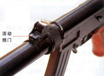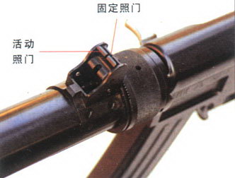 考虑到特业分队夜战的需要,在冲锋枪照门上镶嵌有如图示的两个立式长效荧光管,准星上镶嵌有一个同样的立式荧光管。这样就构成了三立柱式的夜瞄装置。