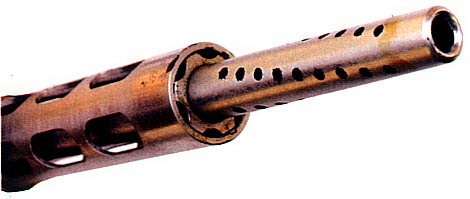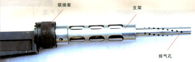在枪管壁上沿着枪膛阴线开有4×9共36个侧排气孔,射击时部分高压火药燃气从侧孔排出,在套筒内膨胀,使膛口排出的火药燃气流量大为减少,压力也大大下降。但每个侧排气孔都是一个噪声源,如果在膛口前方不安装高效声音抑制系统,由试验得出,枪口总噪声级反而会增加。