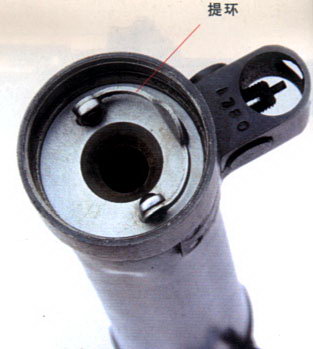 复进机构由复进簧和复进簧导杆组成,导杆后部有一突起是用来固定机匣盖的。在机匣后立壁的前面还有一个缓冲垫,它主要用来吸收自动机后坐到位时多余的能量,改善枪机撞击机匣时的受力状况,用以提高机匣的寿命。